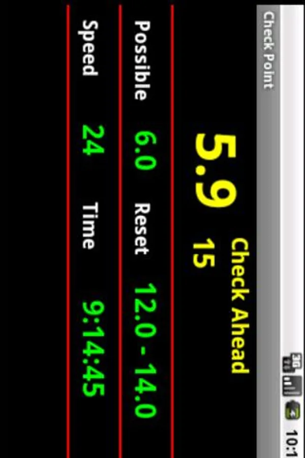 The main feature of the display is the correct current mileage. This tells the rider where he should be at all times. The rider strives to keep his odometer mileage equal to the mileage displayed by CheckPoint. When free to proceed, the mileage is in green numbers, accompanied by the word 'Go', also in green. As a possible check draws near, the color changes to yellow with alert 'Check Ahead'. As a reset mileage is encountered, the mileage turns to red.