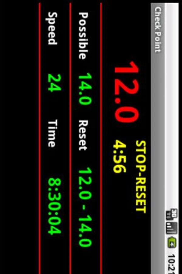 The next Reset mileage is displayed at all times. When a reset mileage is reached, CheckPoint changes the mileage color to red and displays an alert 'Stop - Reset'. The reset mileage is displayed on screen to allow the rider to reset his odometer. During the reset a countdown timer displays the time remaining before departure.