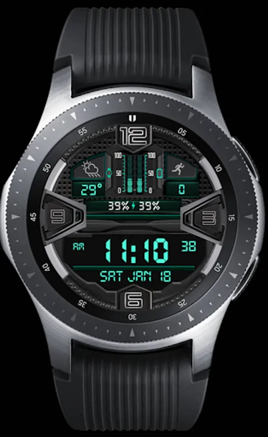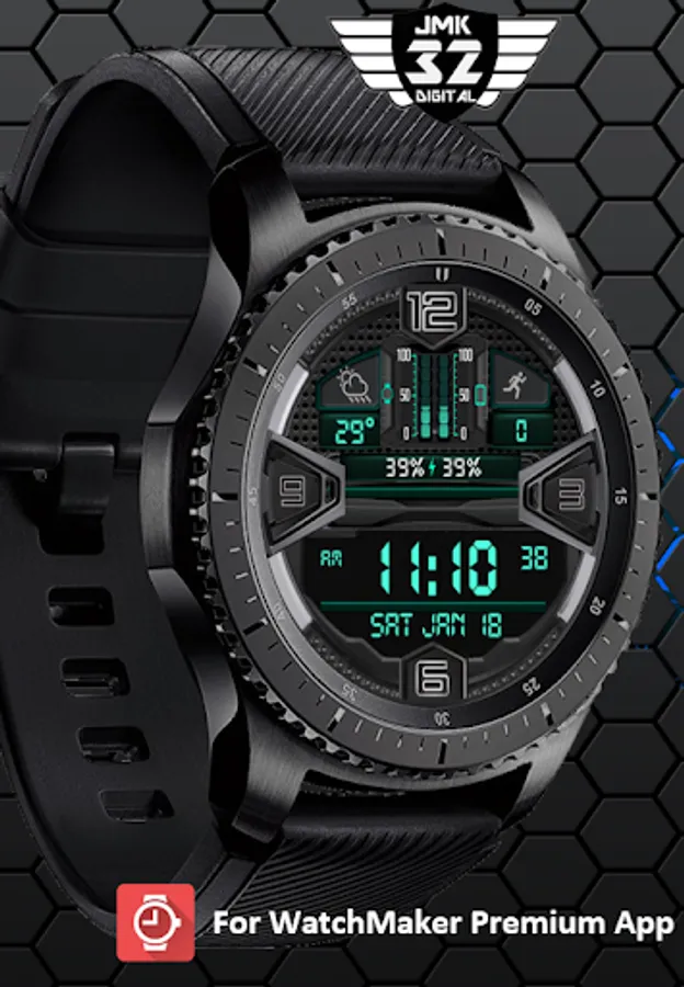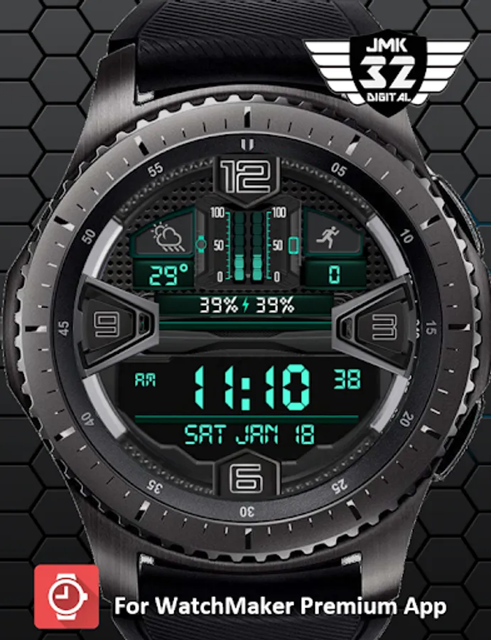 Stylish digital watchface for WatchMaker with key info at a glance. This watchface has key info at a glance including dual battery meters and % for watch and phone, weather and conditions, step count, day/date, and more. For Android Wear OS and Samsung watches with WatchMaker.