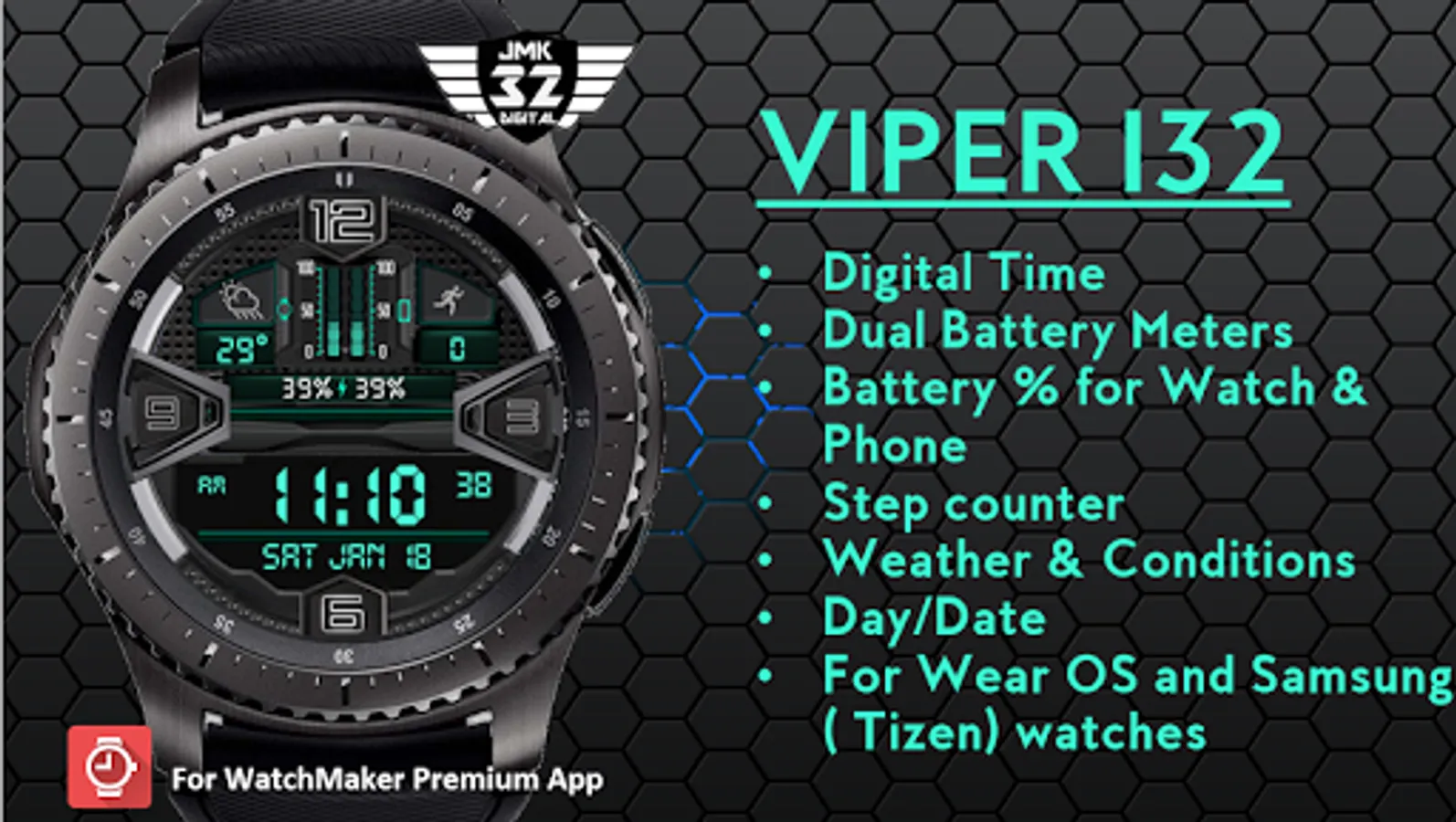 This VIPER 132 watchface is an interactive, distinct, stylish, multi-informational watchface for Android Wear OS and Tizen watches with all pertinent info at a glance:
