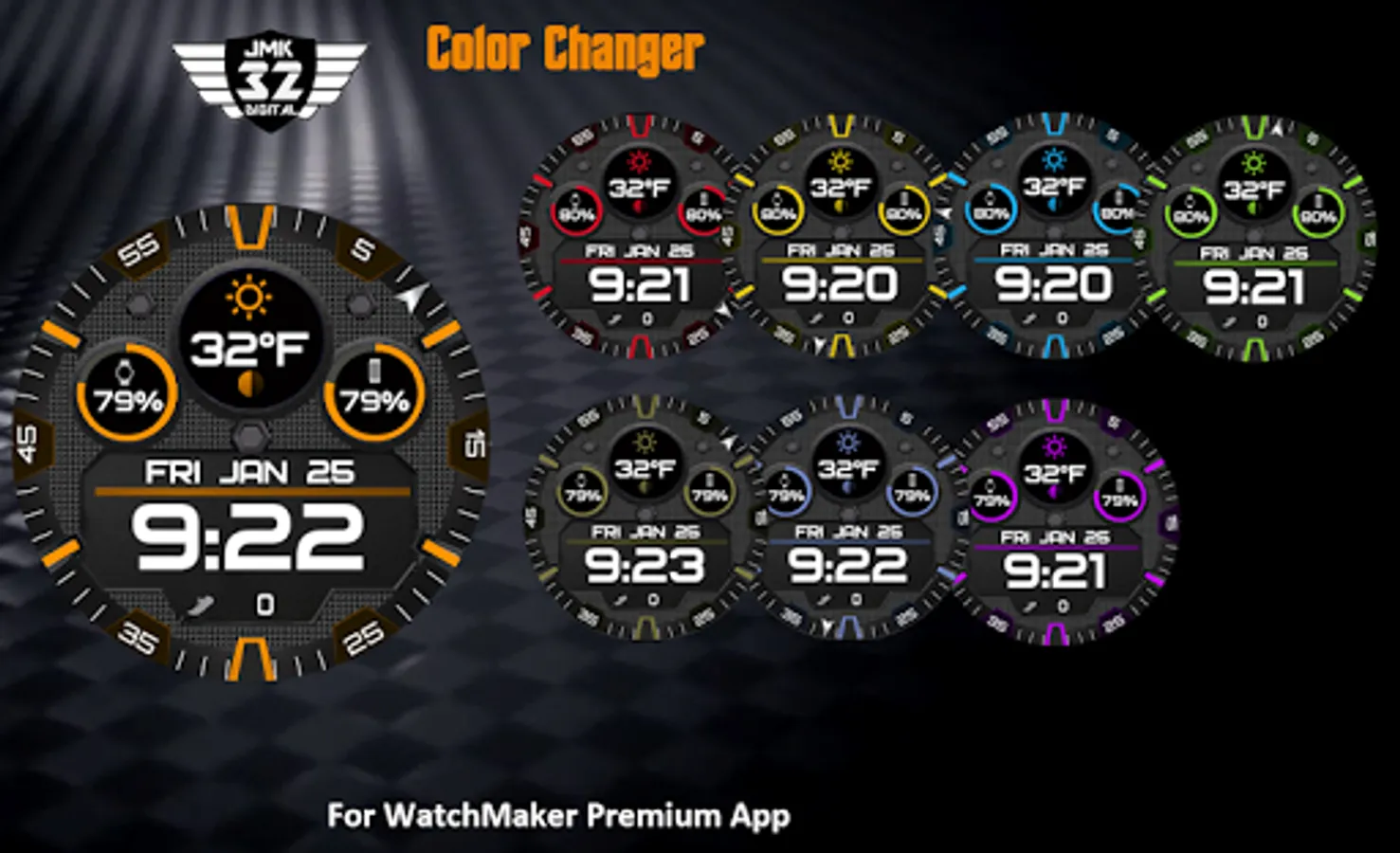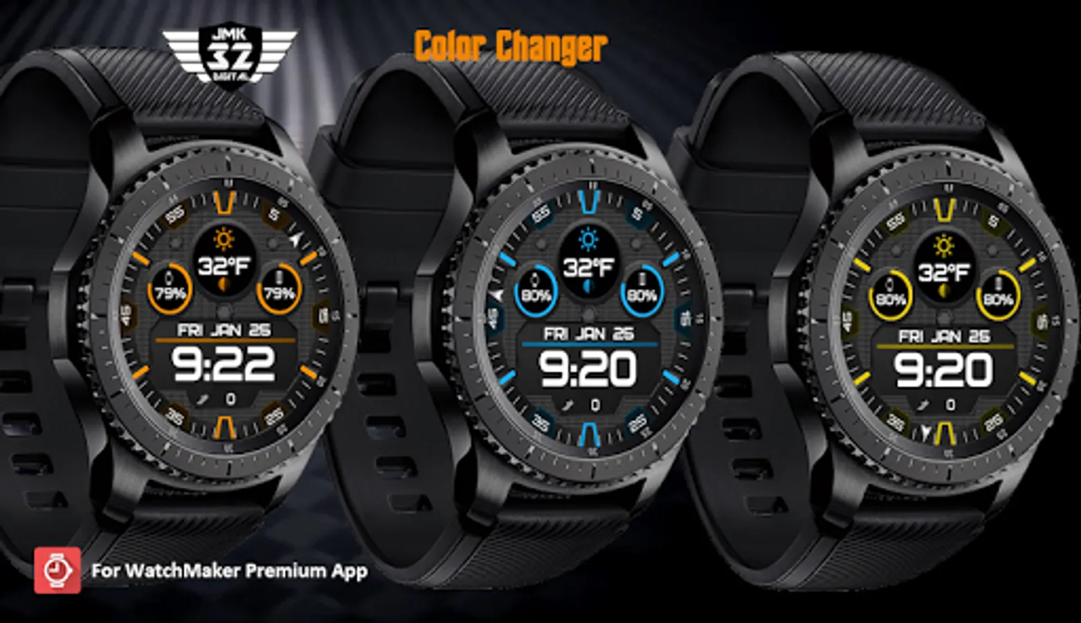 Stylish digital watchface for WatchMaker with color changer, dual battery meters, and key info at a glance. Tap the top of the screen (12 o'clock position) to switch colors and cycle through over 20 colors. This watchface has key info at a glance including dual battery meters and %, weather, steps, day/date, animated econds, and more. For Android Wear OS and Tizen watches with WatchMaker.