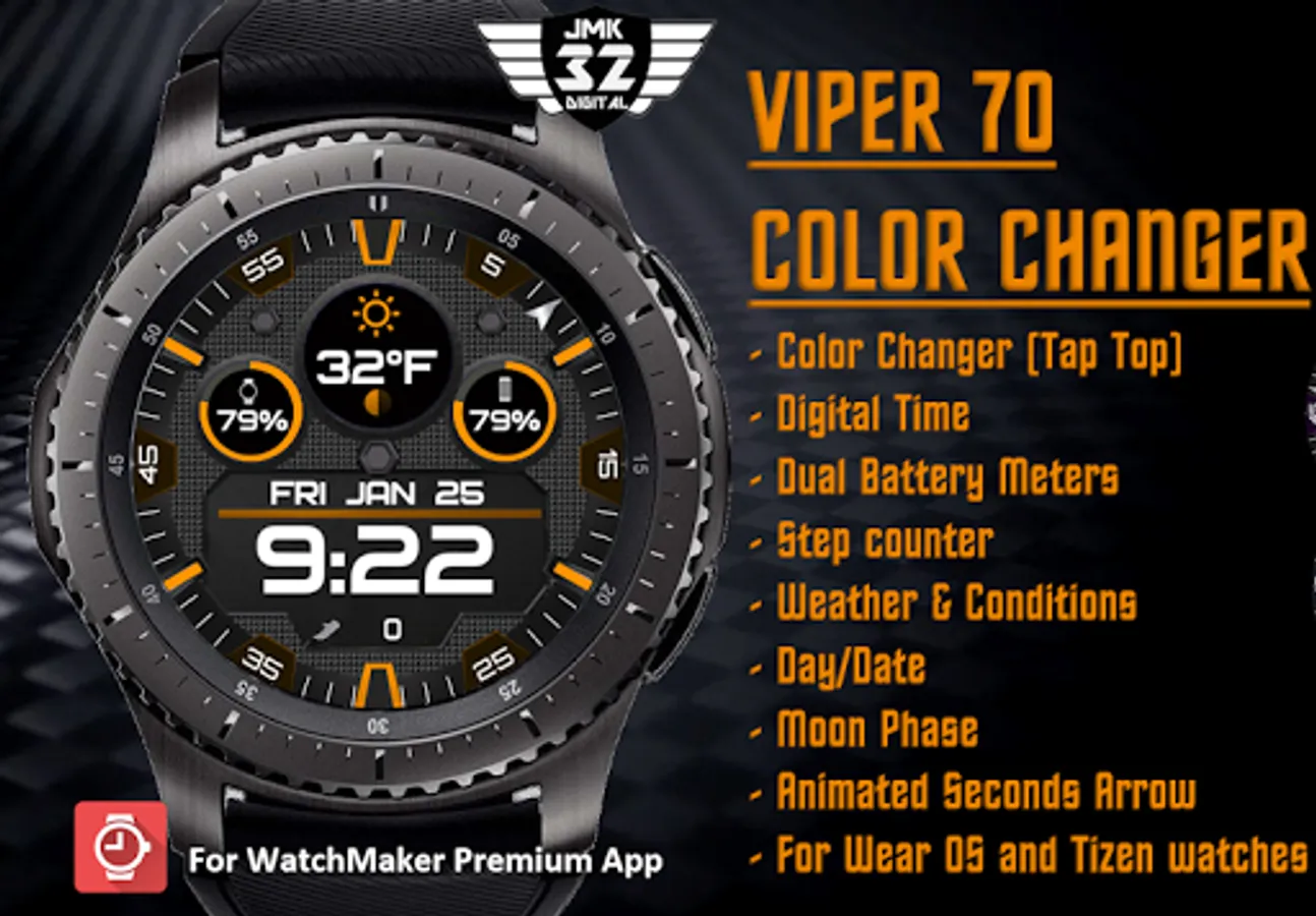 This VIPER 70 color changer watchface is an interactive, distinct, stylish, multi-informational watchface for Android Wear OS and Tizen watches with all pertinent info at a glance: