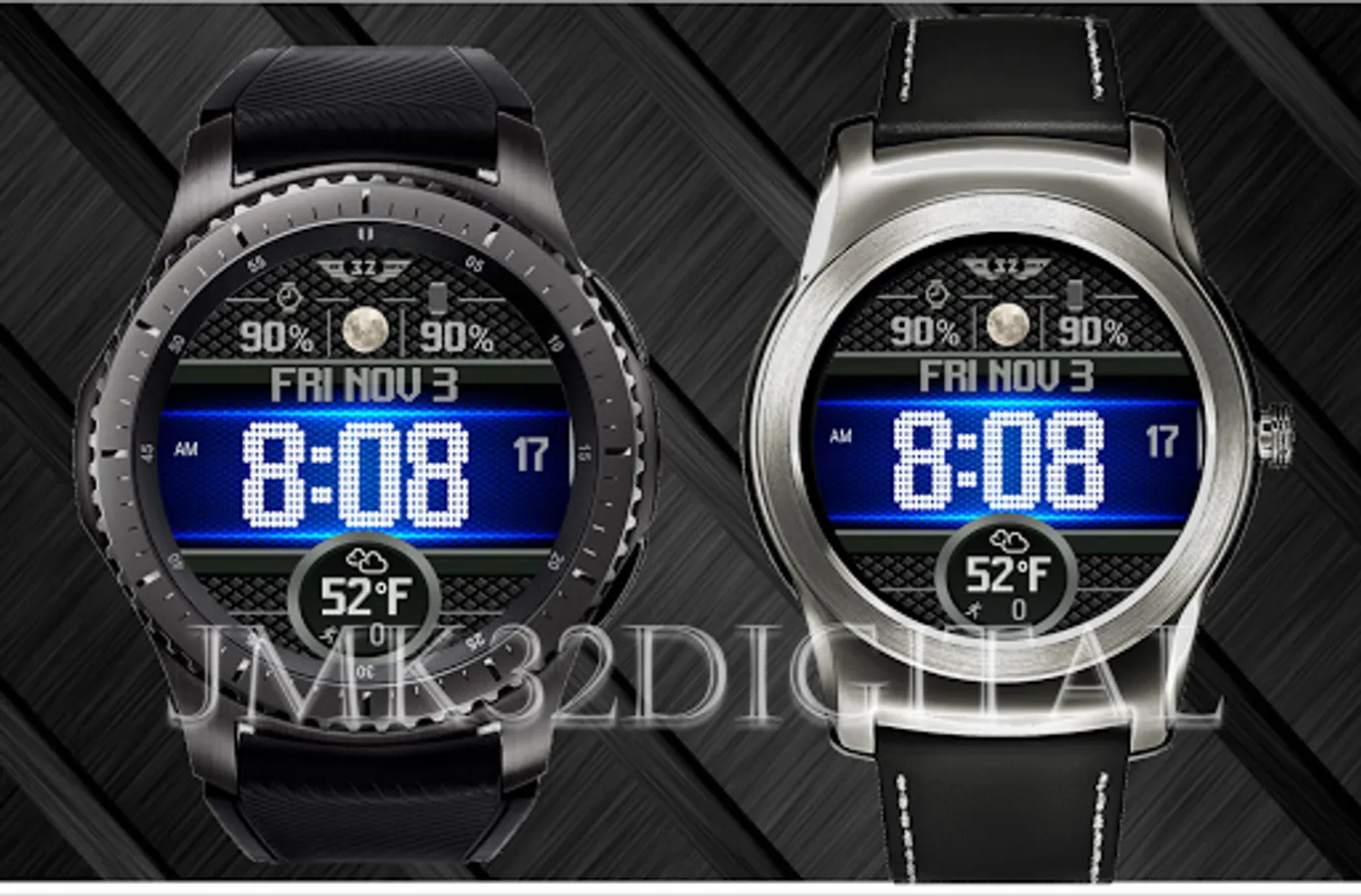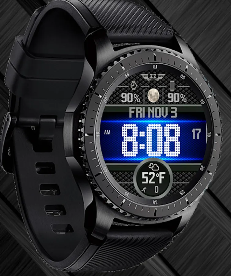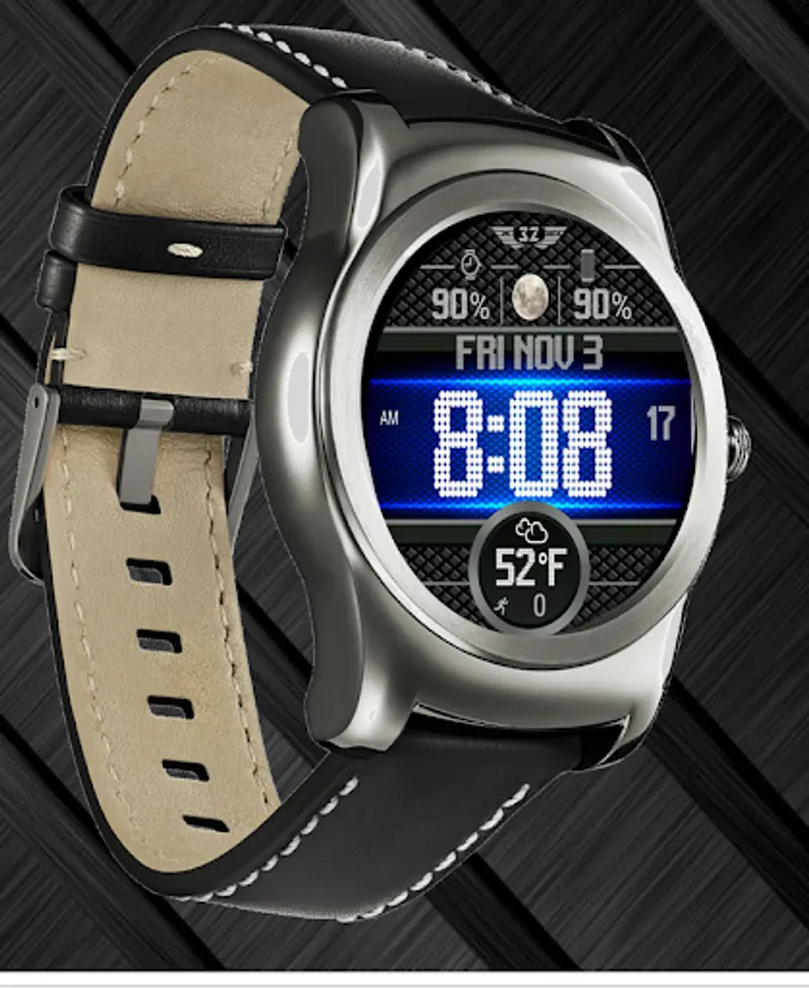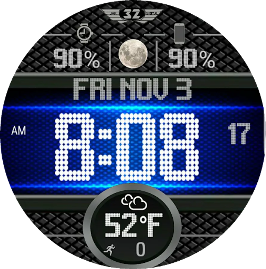 This Viper One watch is a distinct, multi-informational watchfaces with all pertinent info at a glance and features a 12hr digital clock with seconds, with watch and phone battery % levels, calendar, current weather, step counter and moonphase in a stylish face that looks fantastic on a wide variety of Android Wear smartwatches.
