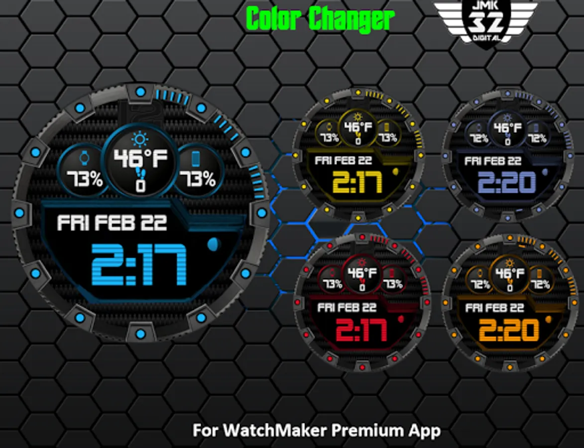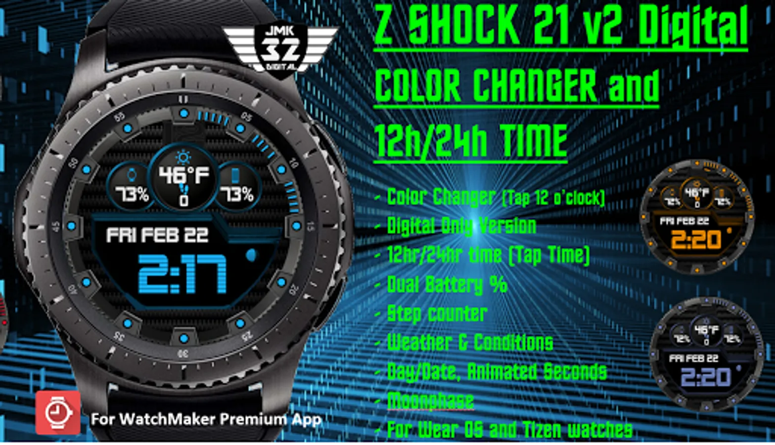 Digital version of the Z SHOCK 21 watchface for WatchMaker with color changer, 12hour/24hour time and key info at a glance. Tap 12 o'clock to switch colors and cycle through over 20 colors. Tap time to switch from 12h to 24h time. This watchface has key info at a glance including dual battery %, weather, steps, day/date, moonphase, and more. For Android Wear OS and Tizen watches with WatchMaker.