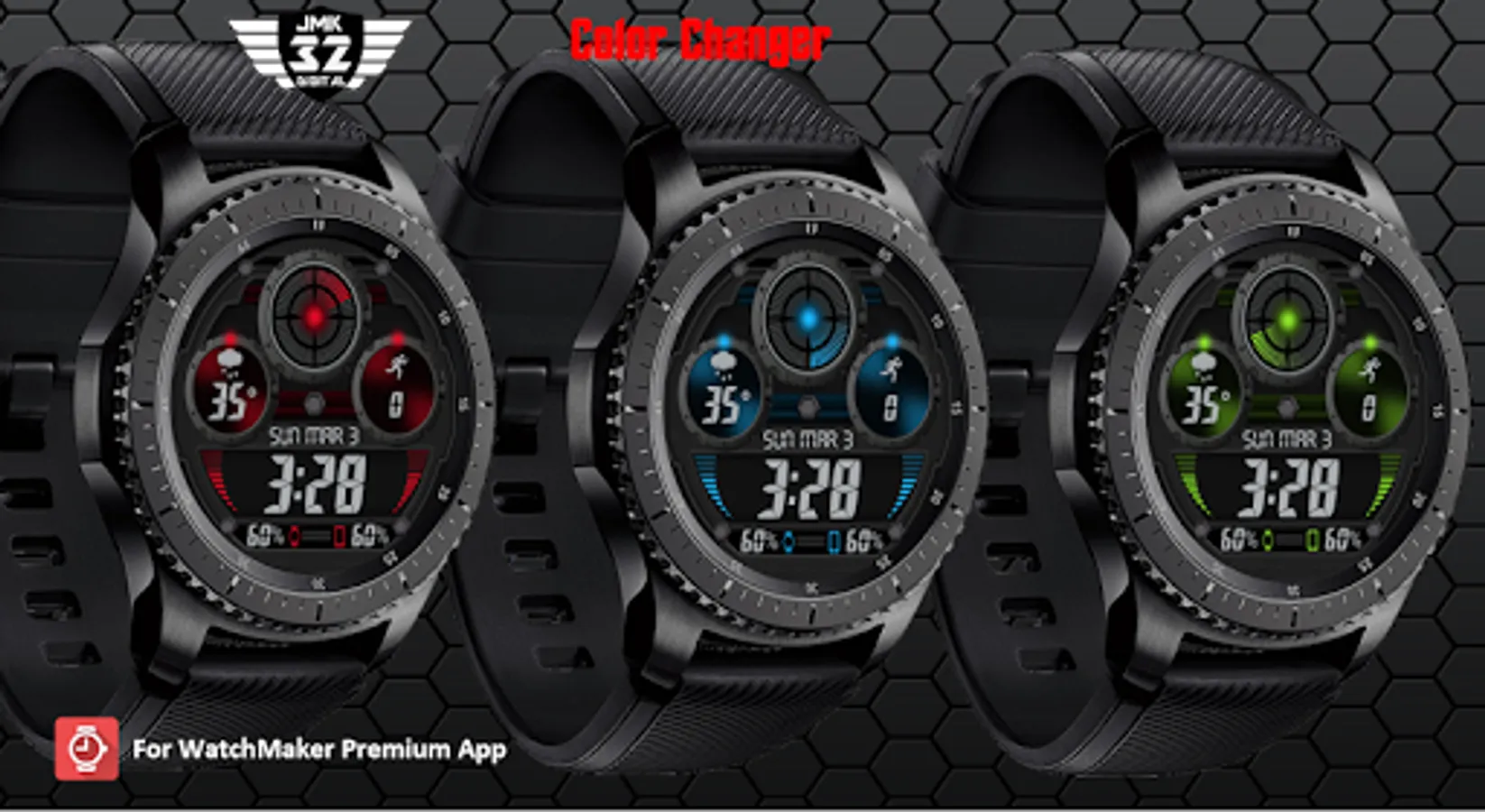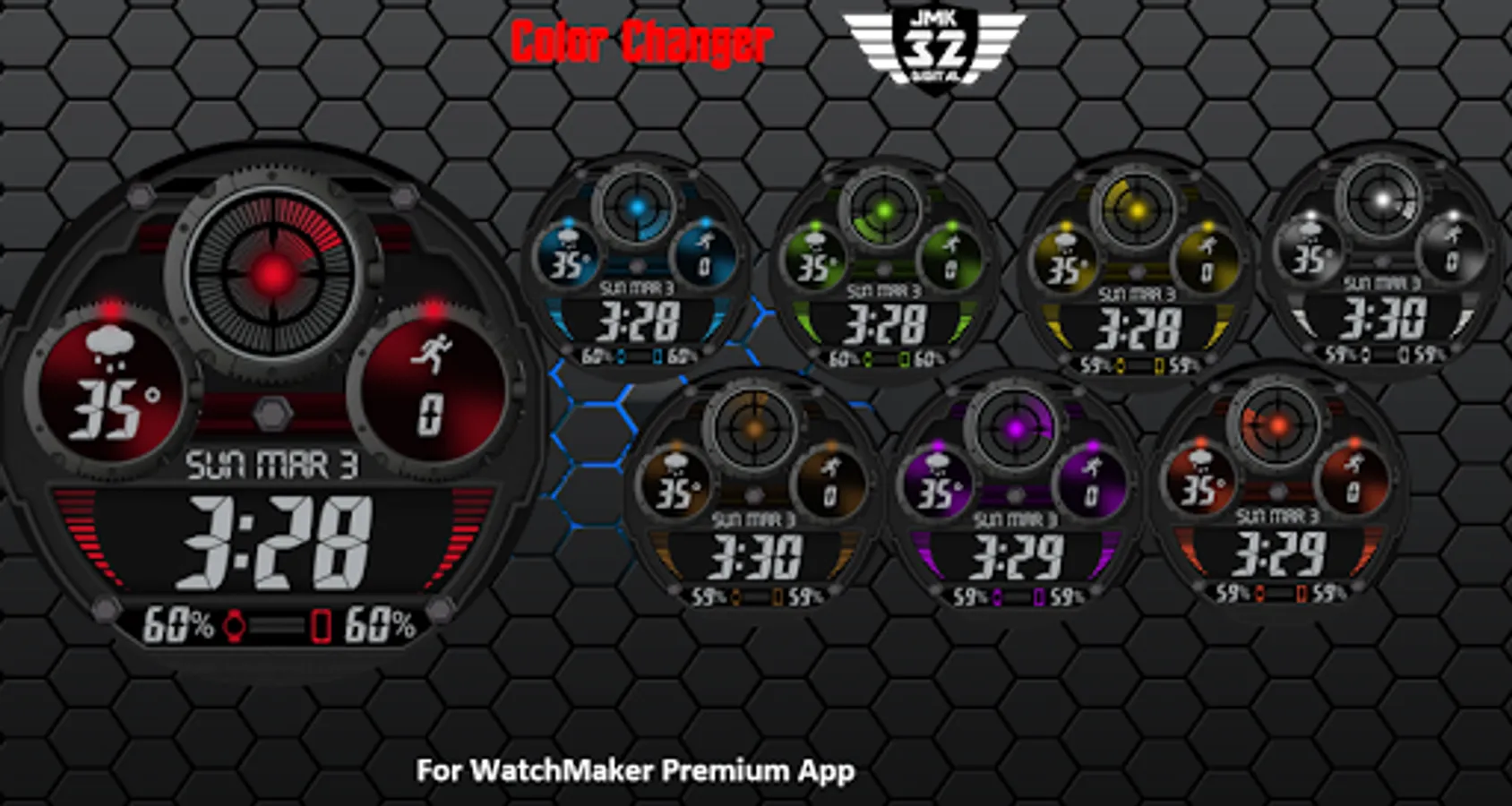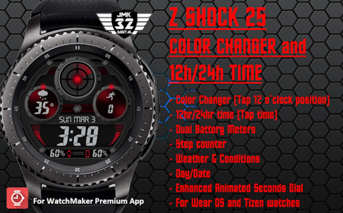 This Z SHOCK 25 color changer watchface is an interactive, distinct, stylish, multi-informational watchface for Android Wear OS and Tizen watches with all pertinent info at a glance:
