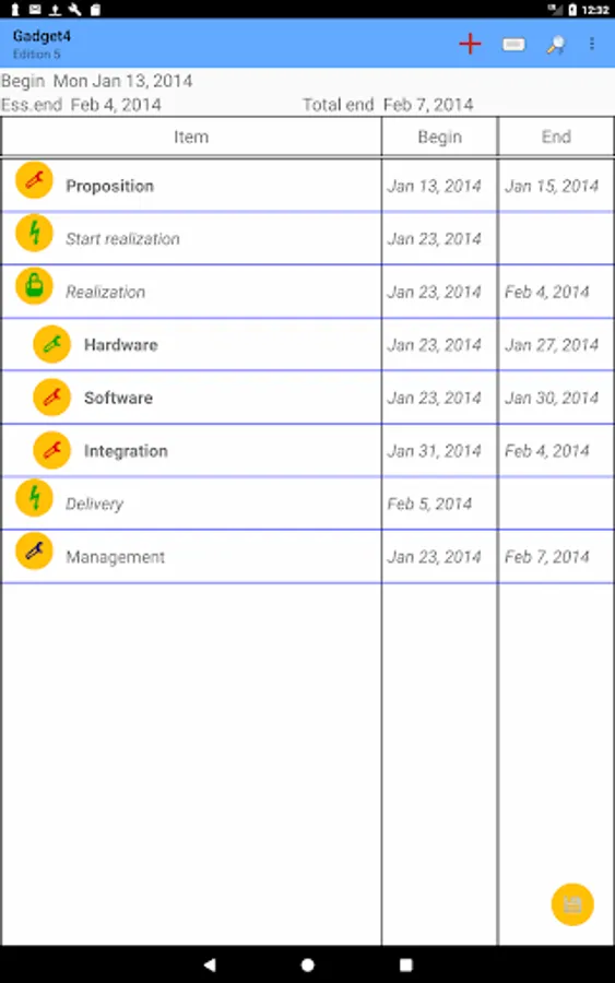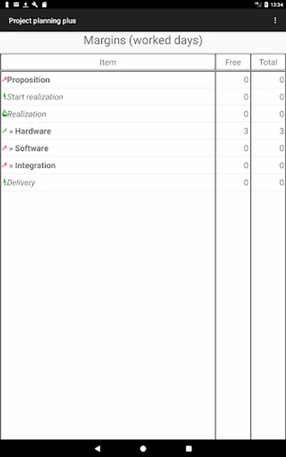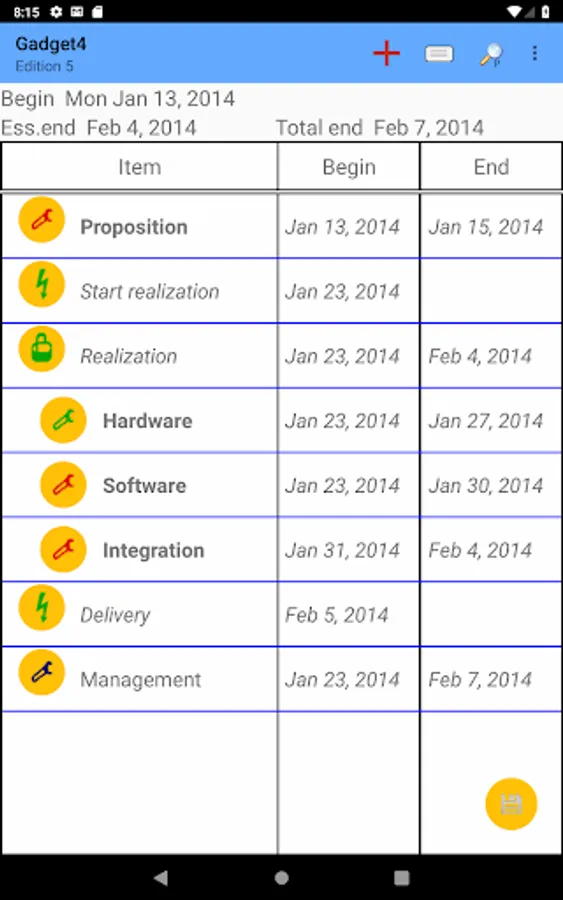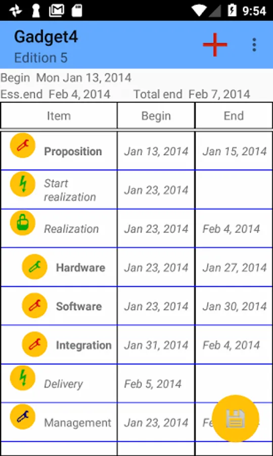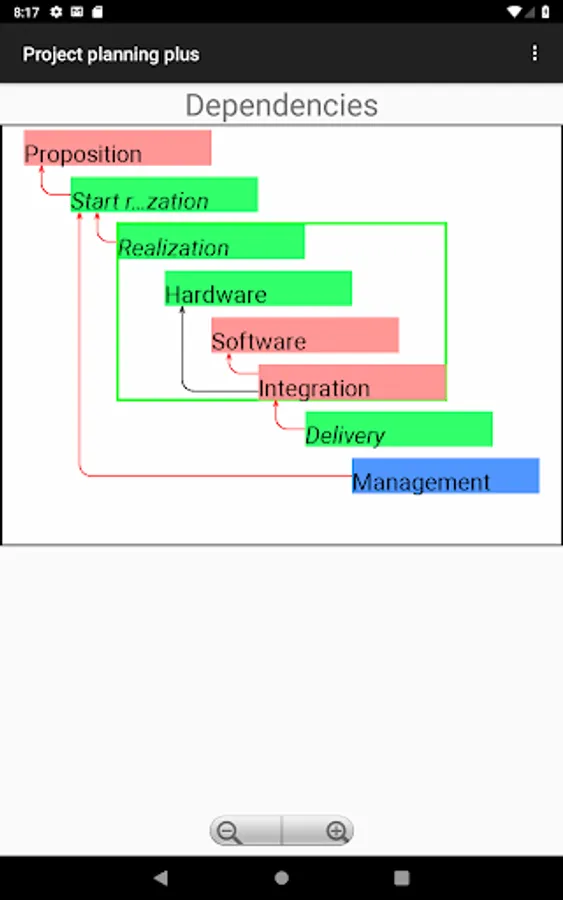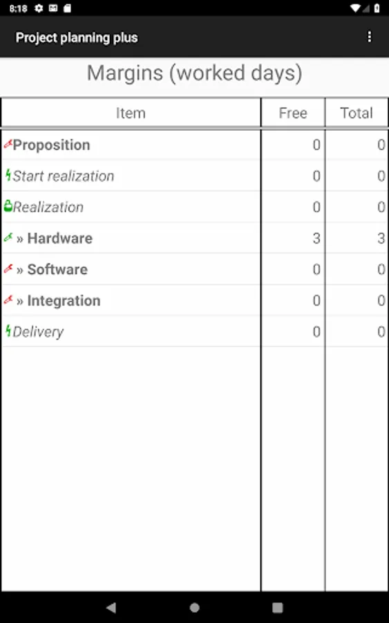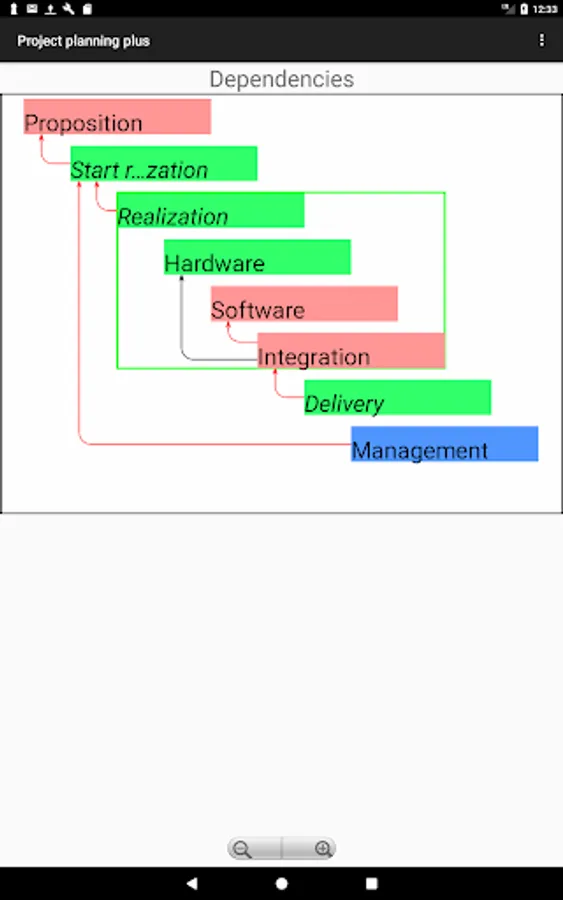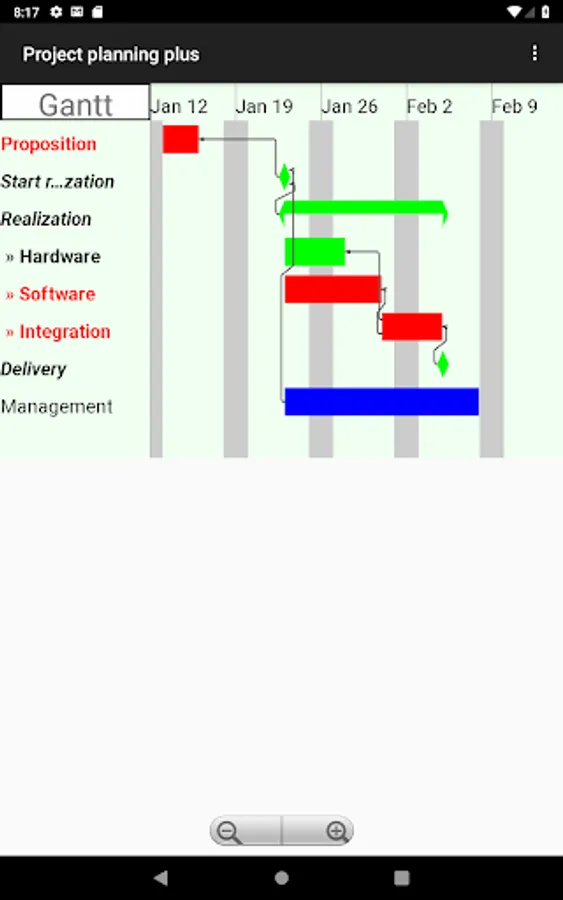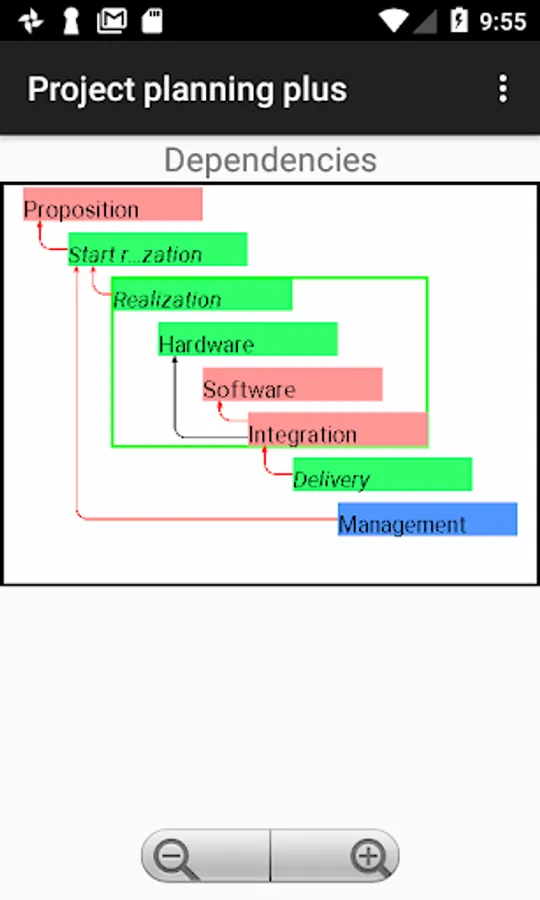 Project planning plus plans your projects from the decomposition of works into tasks, the estimated duration of the tasks and the links between tasks. The results are presented in the form of tables (beginnings and ends of tasks, margins ...), a Gantt chart and a dependency diagram. You can view them on your mobile or send them as a PDF or CSV file, and view them remotely or print them.