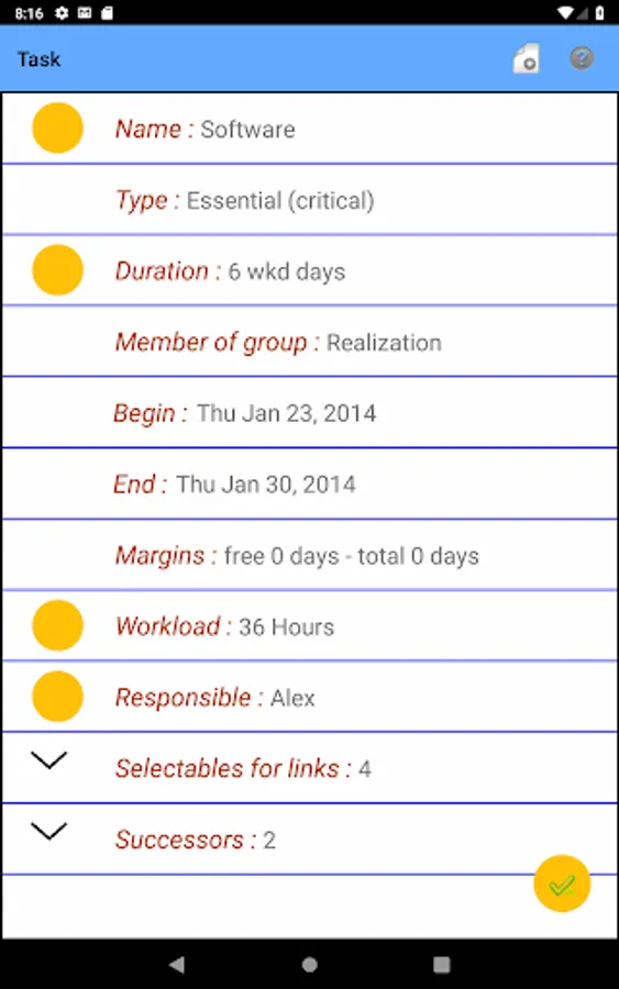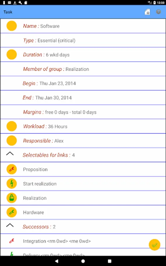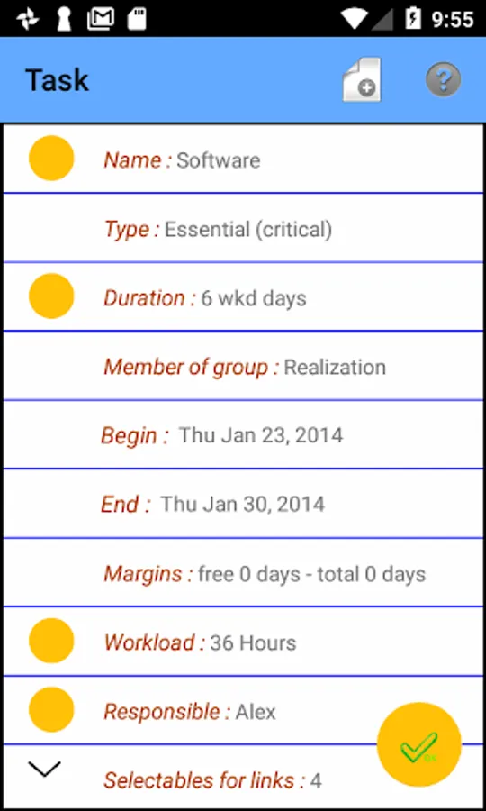- the distinction between two types of tasks, essential and ancillary, only essential tasks are taken into account for the calculation of margins and the determination of critical paths,