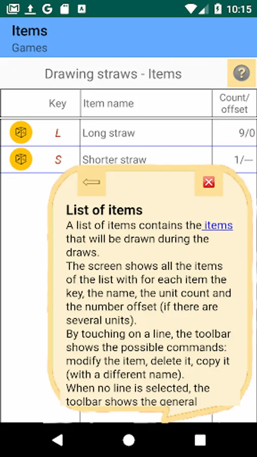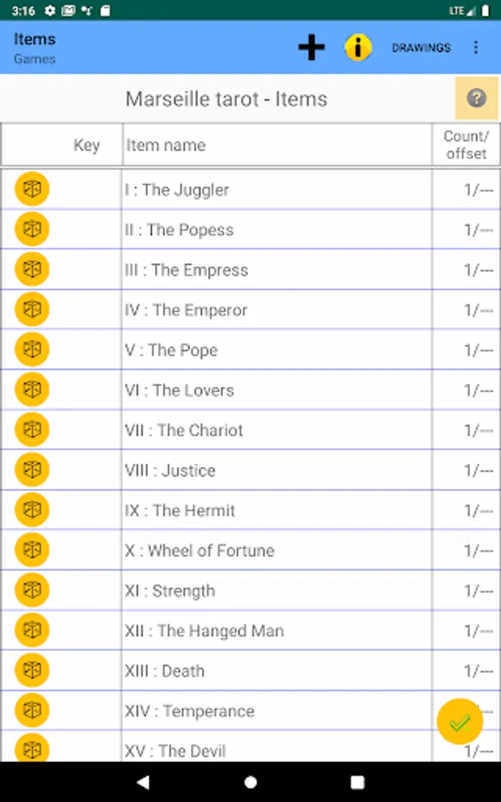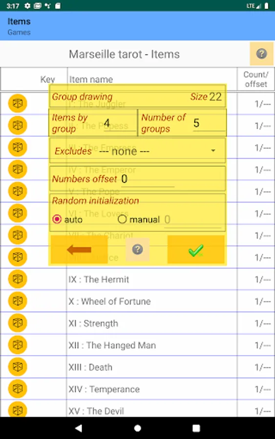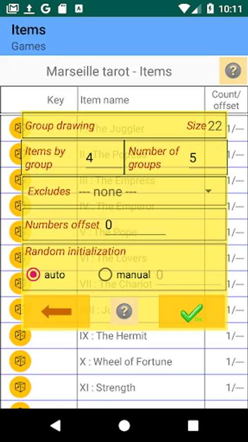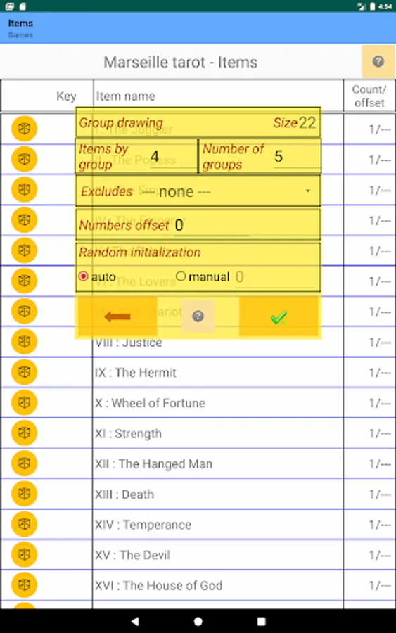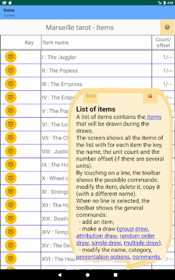 And, as examples, the program provides some predefined lists: heads or tails, short straw, 6 dice, 52 cards, Marseille tarot.