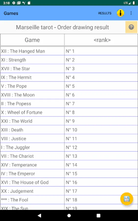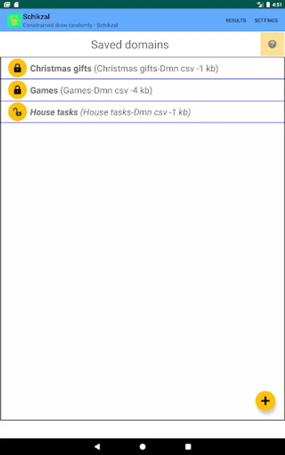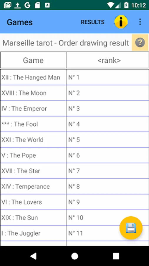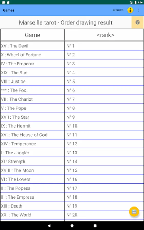 The results of a draw are presented in the form of a table in the program. You can merge draw results and save them as CSV text files in the mobile's extended memory. You can export them as PDF files for printing, saving in the "cloud" or transmission to other people; .. And, if the formatting of the program does not suit you, you can export the CSV file, enter it in a spreadsheet and make your own layout.