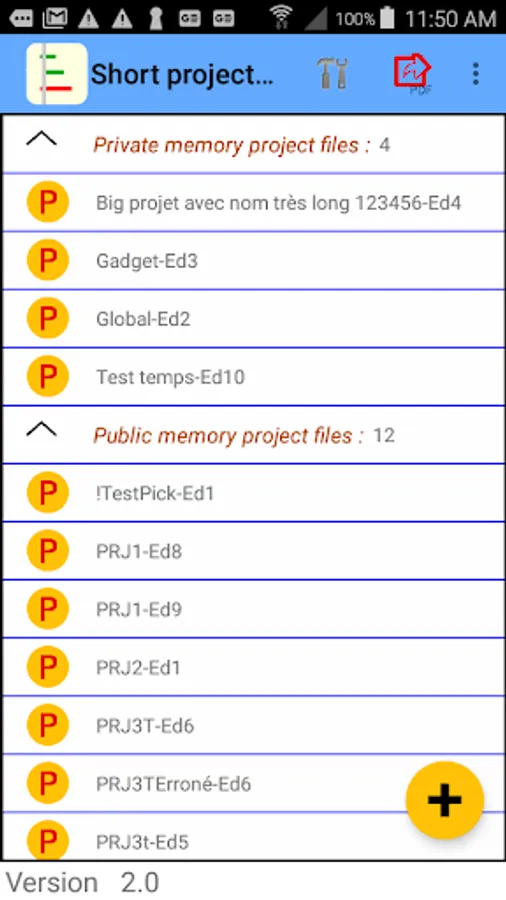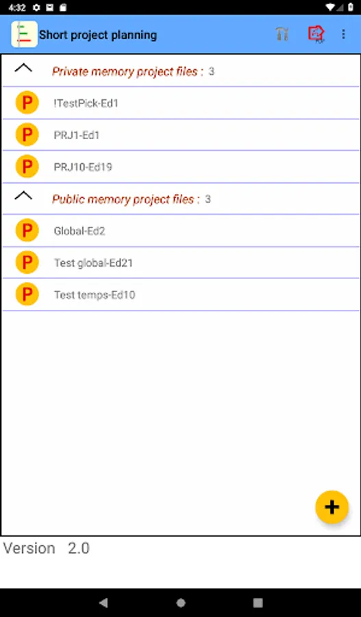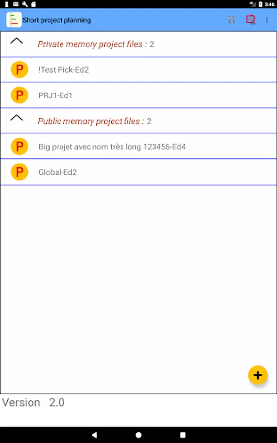 - the possibility of creating an unlimited number of projects, each project being saved in an XML file in the mobile memory,