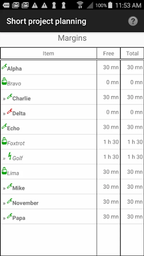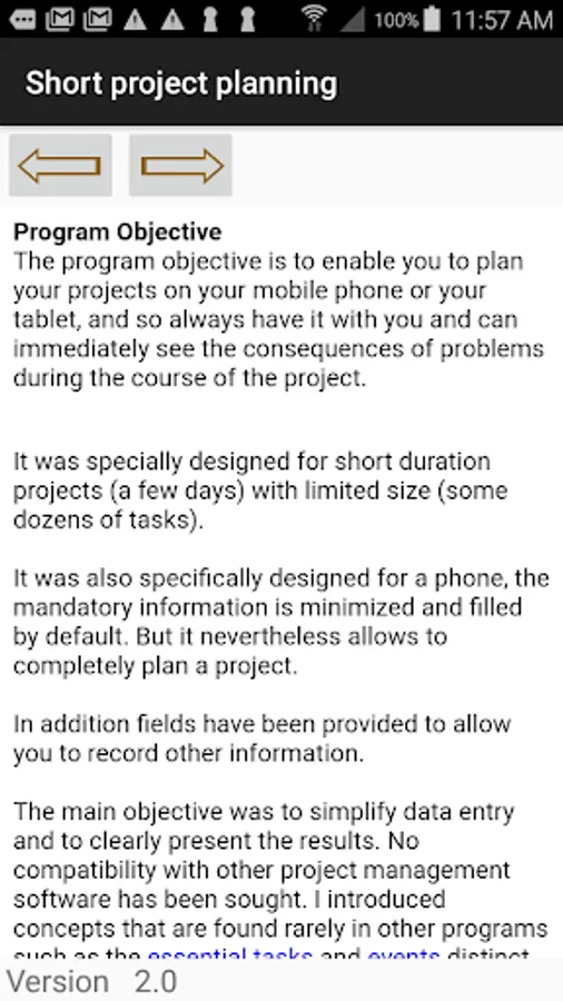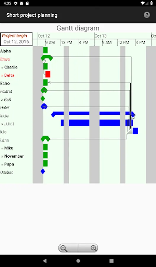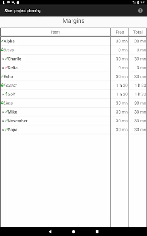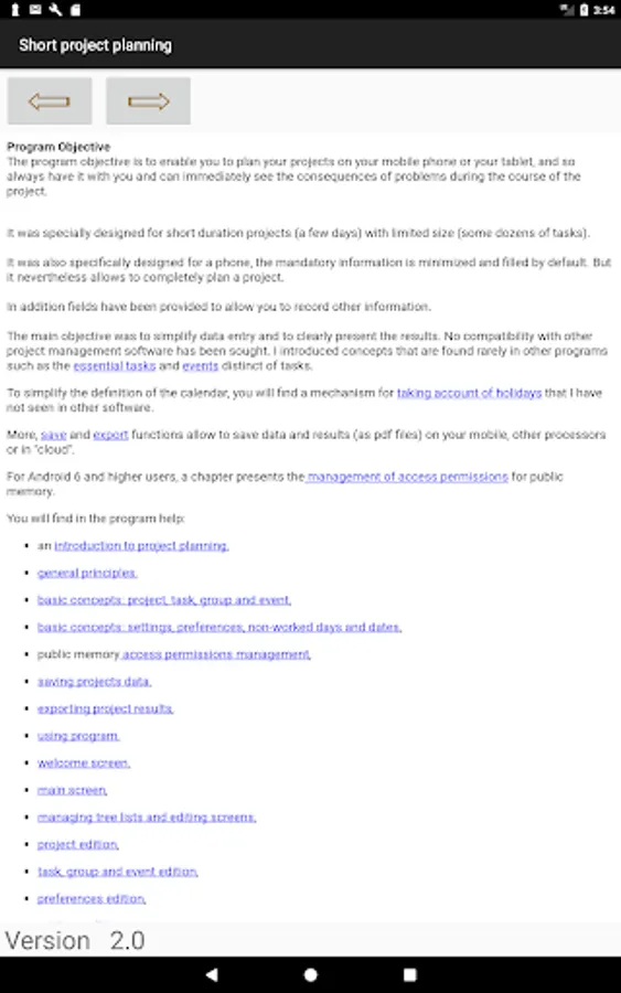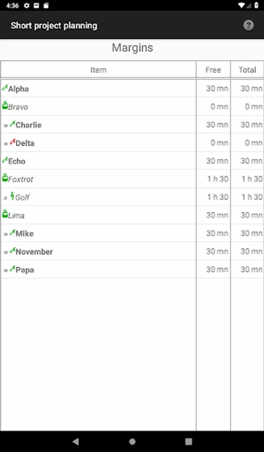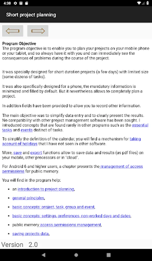 This program has been specially designed for a phone or a tablet, it has not been looked for compatibility with existing software, but rather simplify the input of data and clearly present the results. However you will be able to plan all kinds of short projects. For longer projects where planning may be done in work days, examine the program "Project planning".