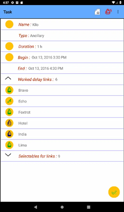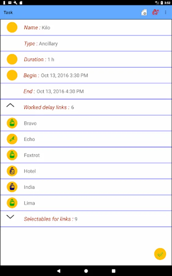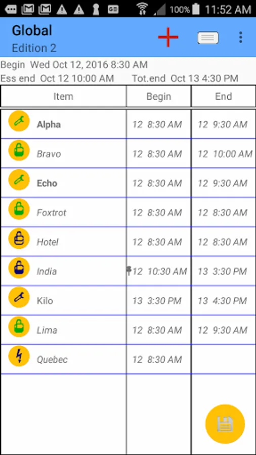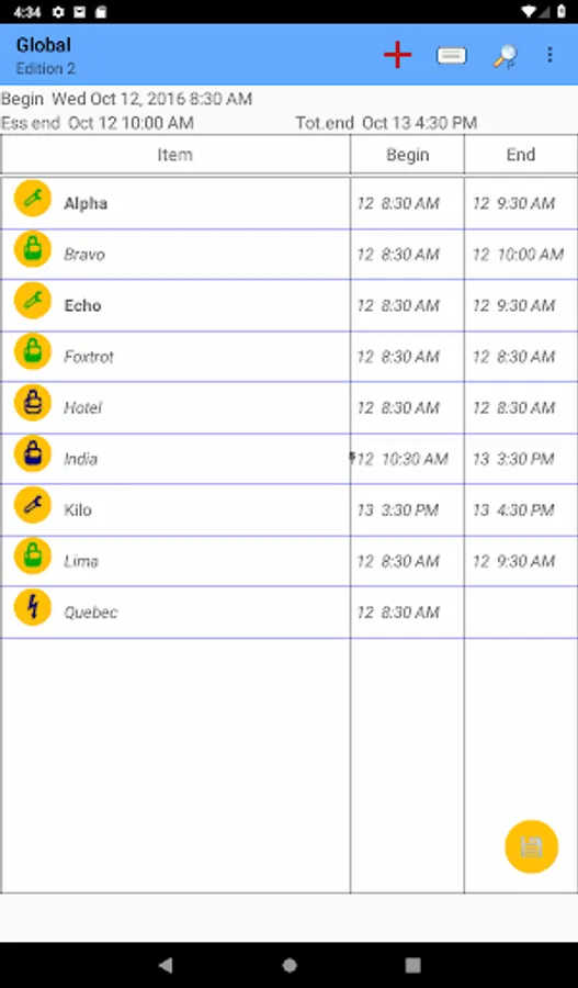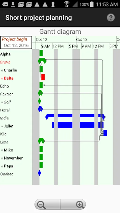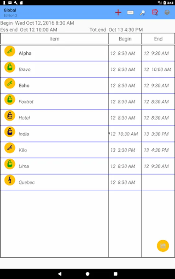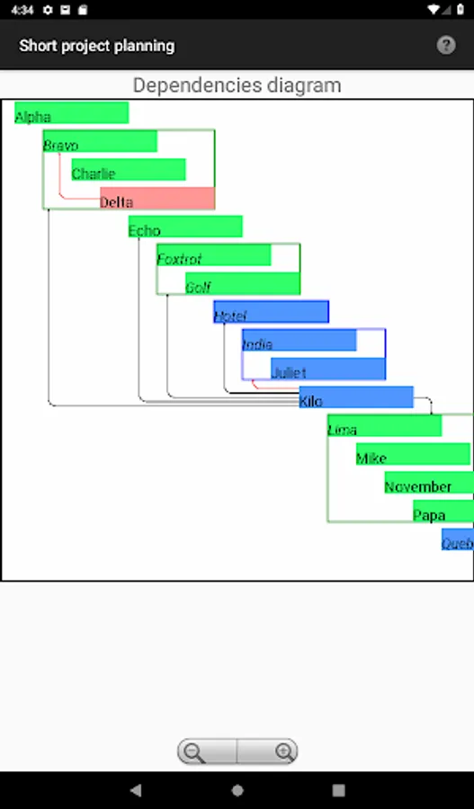 This program has been specially designed for a phone or a tablet, it has not been looked for compatibility with existing software, but rather simplify the input of data and clearly present the results. However you will be able to plan all kinds of short projects. For longer projects where planning may be done in work days, examine the program "Project planning".