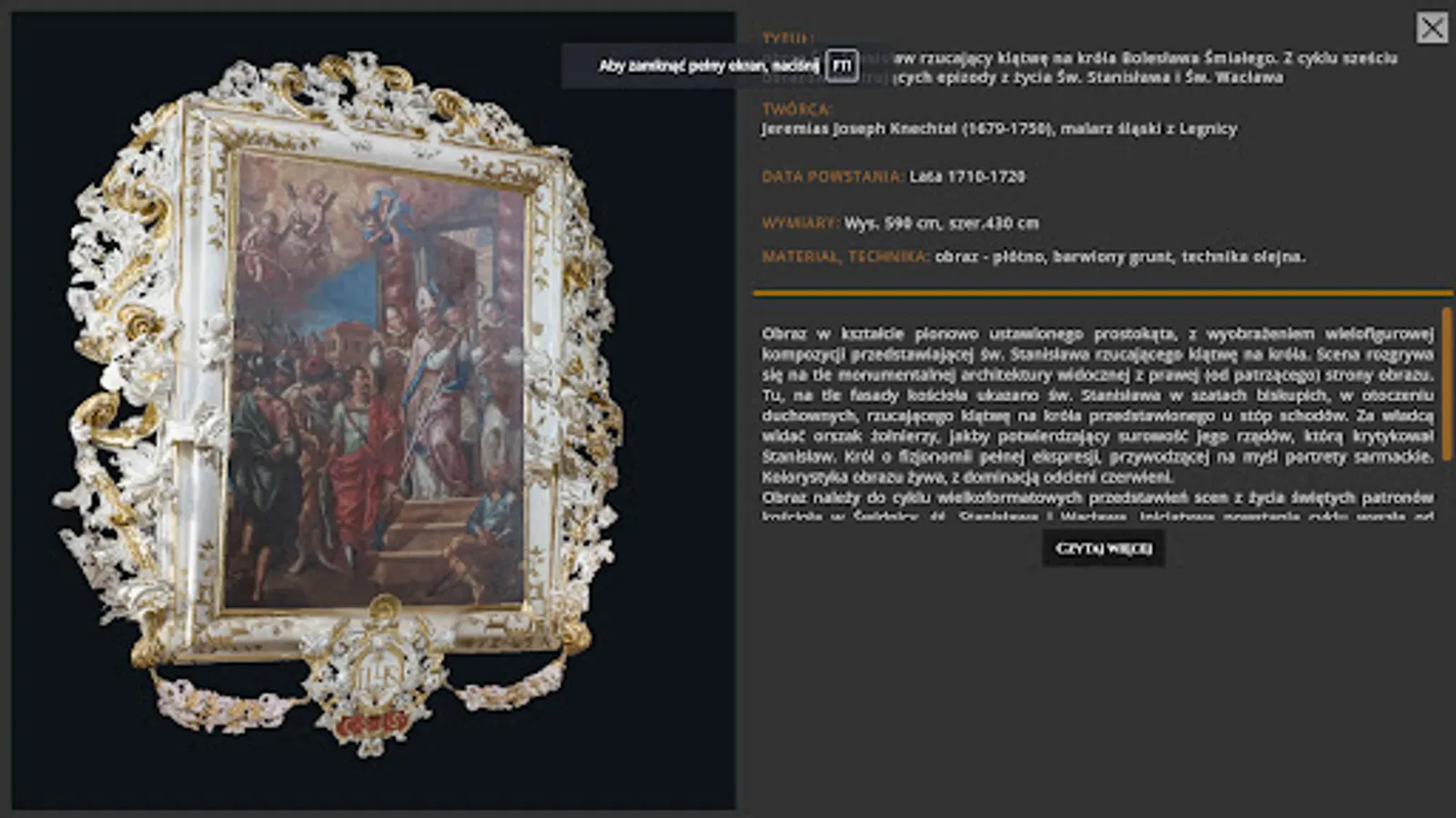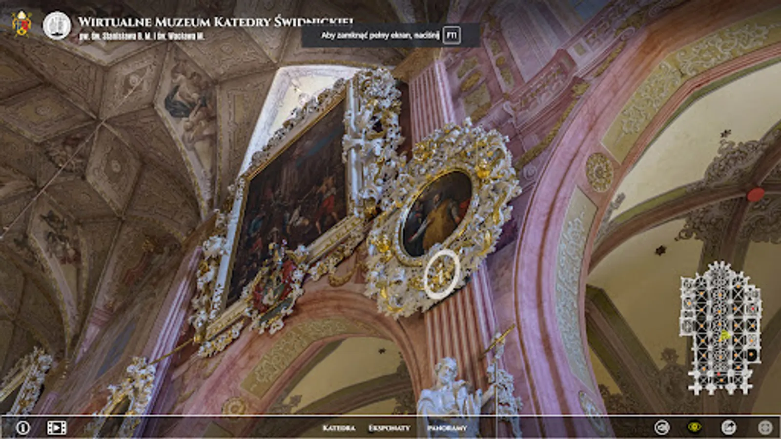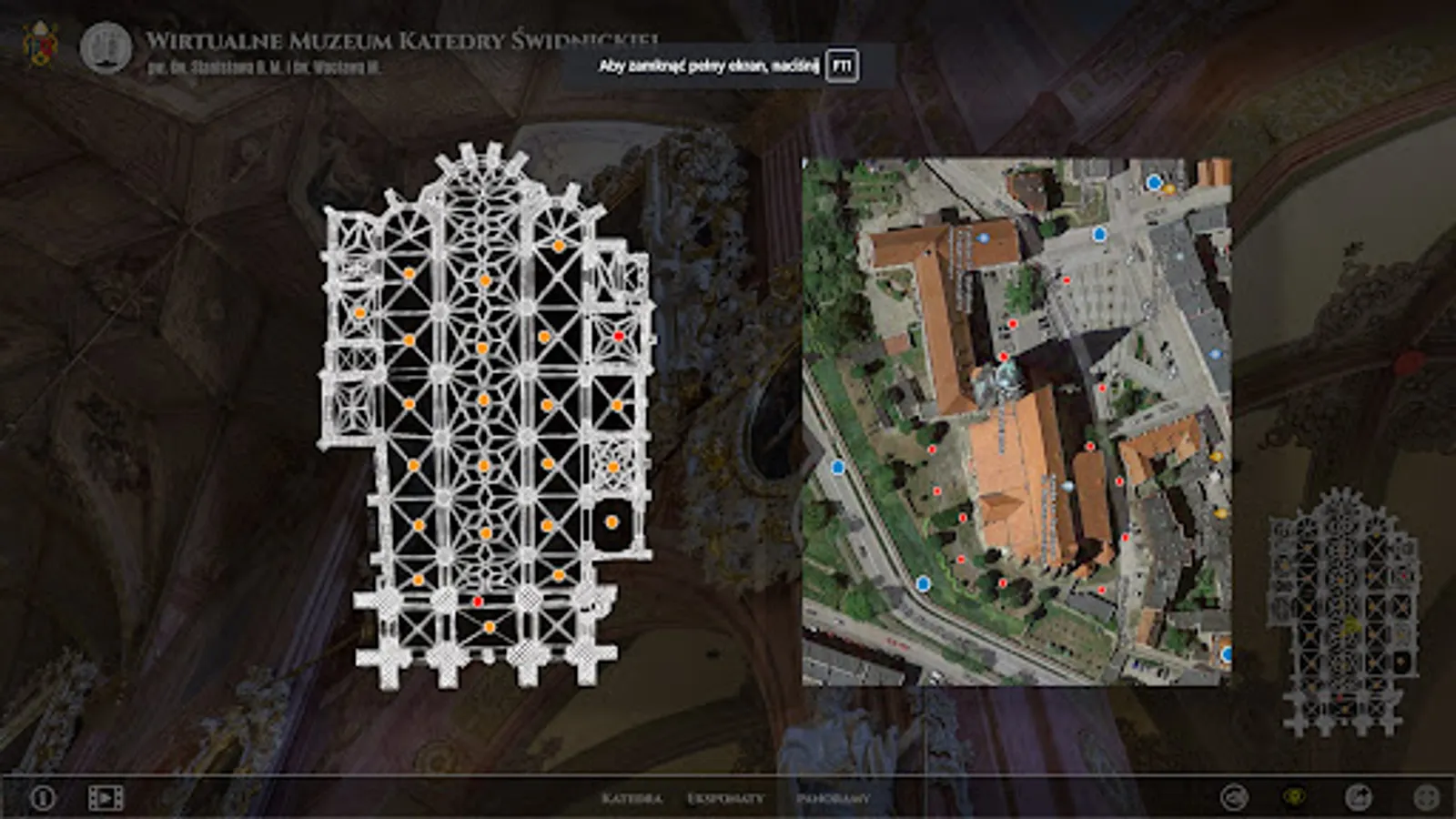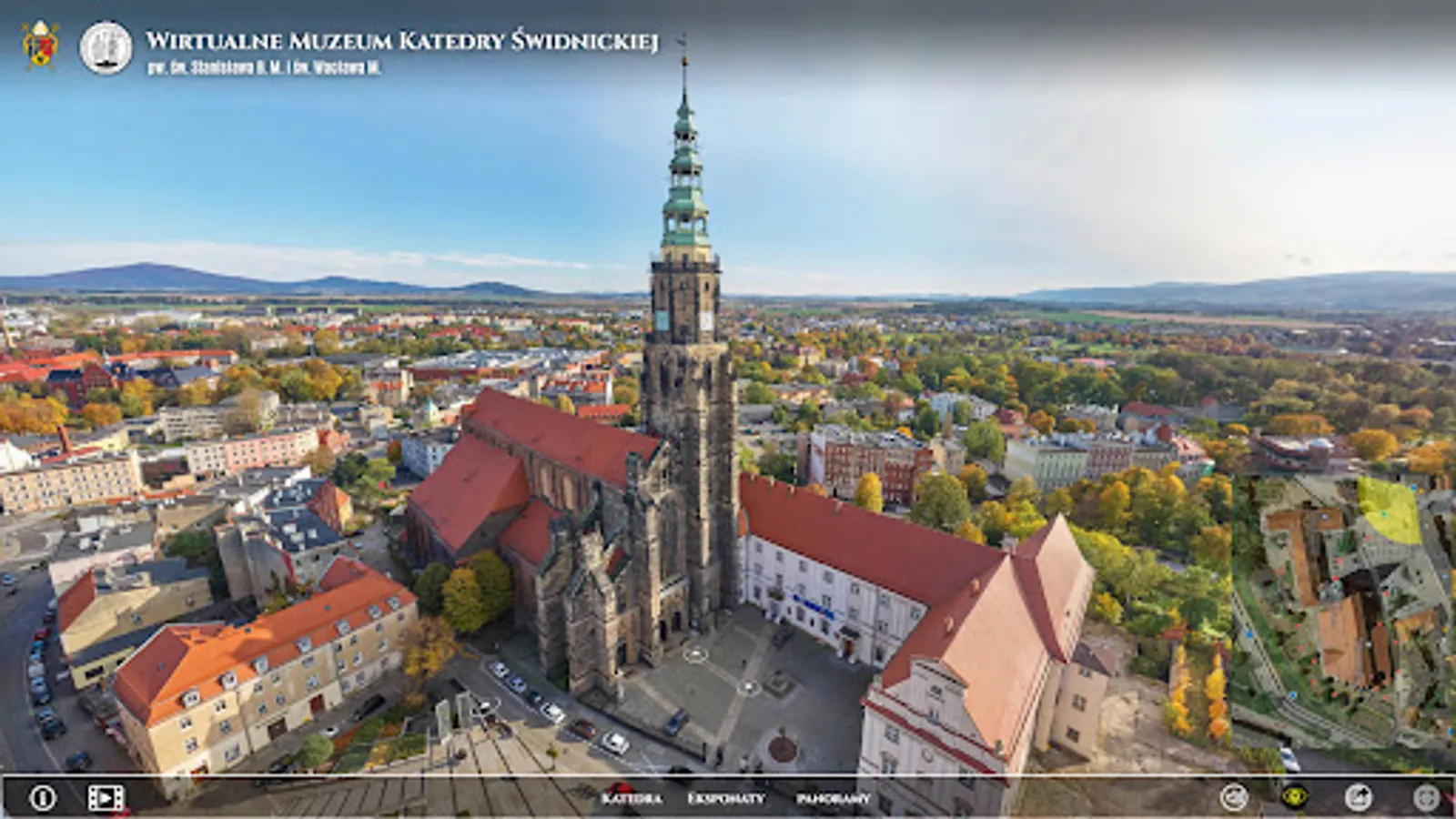 The application allows for a virtual tour of the Świdnica Cathedral. The presentation is based on spherical panoramas: from the drone and inside the cathedral. Richly described images, 3D objects, sounds allow you to get acquainted with the history and the present appearance of the church.