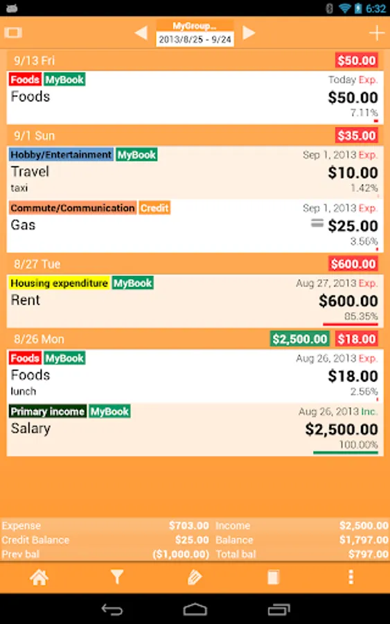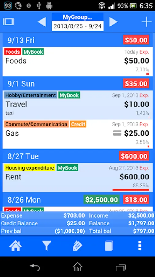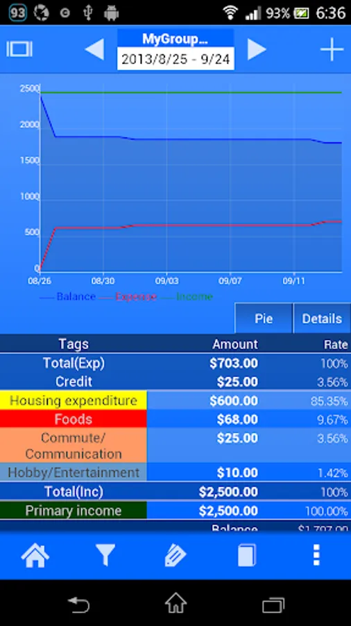 After created many records, Spendroid offers many useful tools to visually analyze your spending habits. It includes filters, filter-sets, charts and group aggregation features.