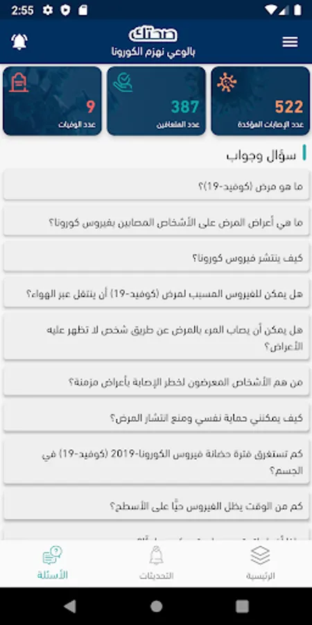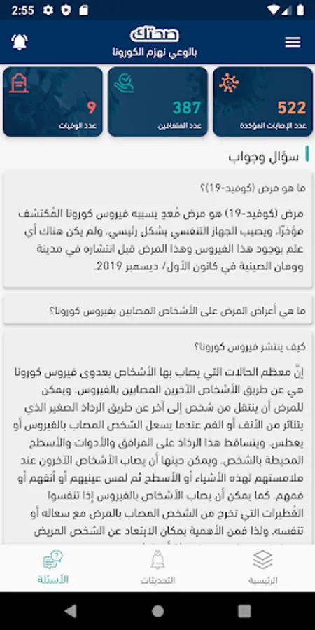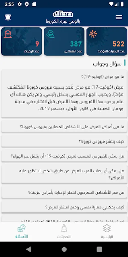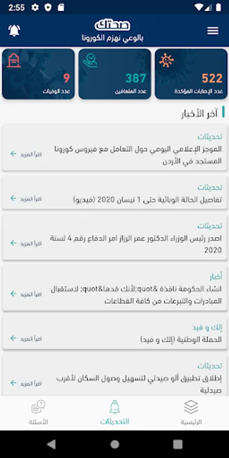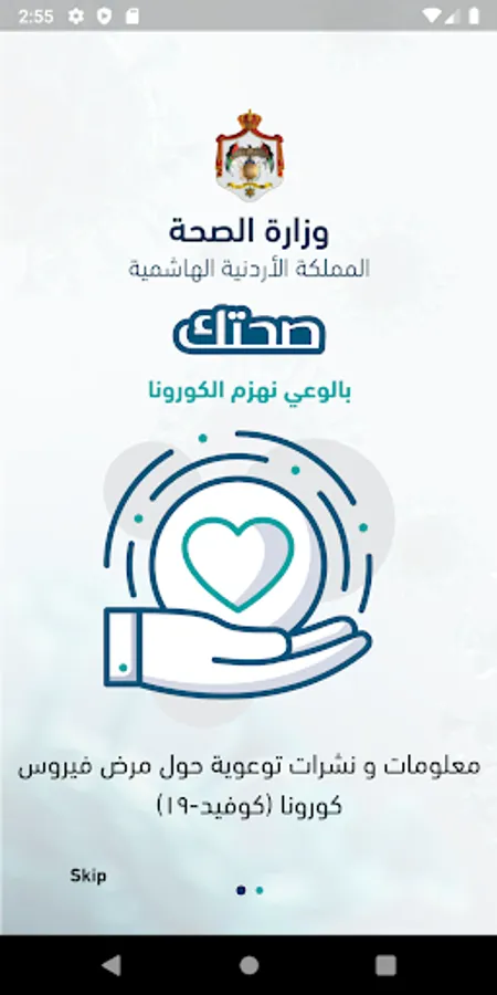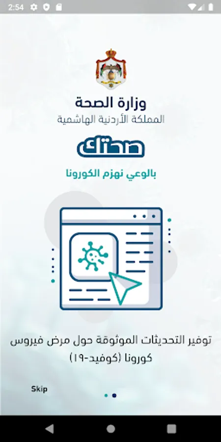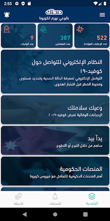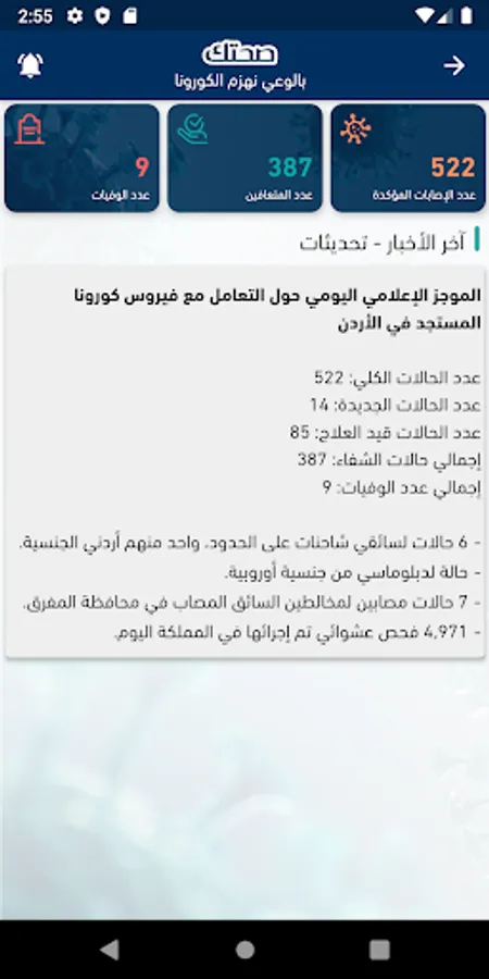 Follow Corona news firsthand in the Kingdom and learn about ways to prevent the virus and how to deal with suspected cases with the application of "your health" launched by the Jordanian Ministry of Health in cooperation with the Royal Society for Health Awareness and the Jordanian Society for Ambulance.