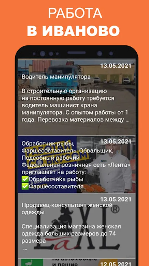 The ability to frequently add new job offers allows you to find the most optimal employment option. Our application will help you find a job or a part-time job in Ivanovo with the necessary working conditions and decent wages in just a few clicks.