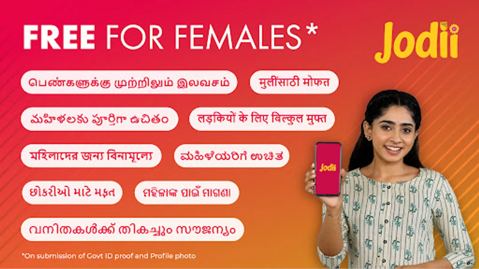 Jodii App is available in 10 languages. Jodii App paid benefits are free for women (up to 10 contacts on govt ID proof verification and profile photo submission)