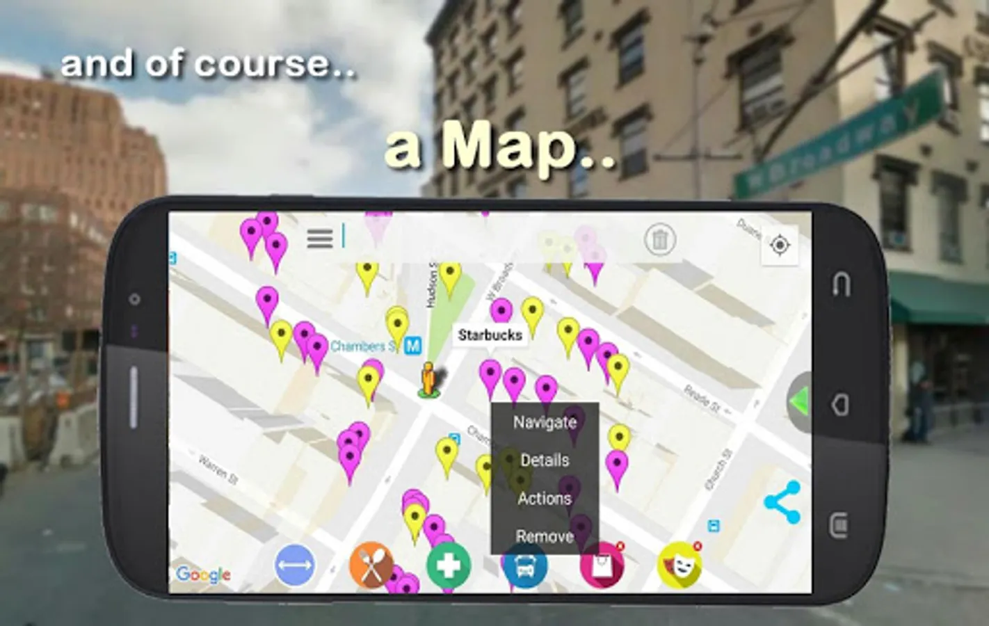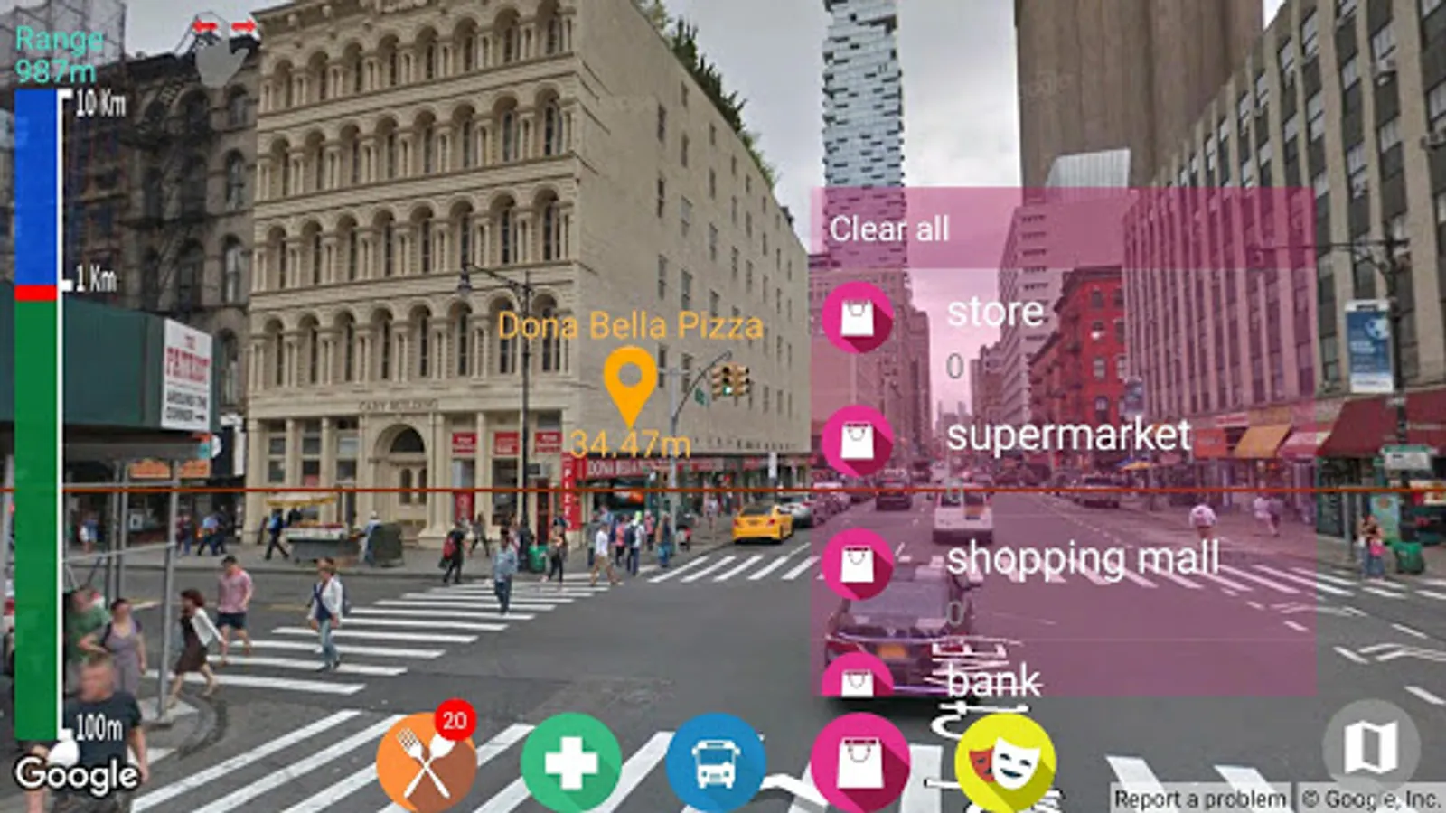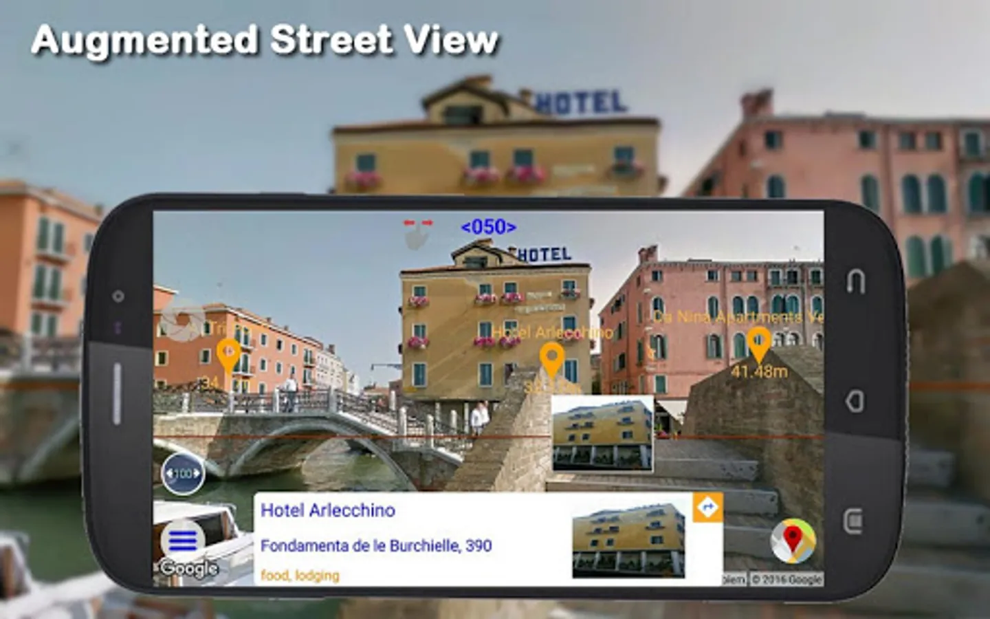 • Discover the area around you using augmented reality, or change your location on the map to discover almost any place in the world using an augmented version of Street View, that makes your virtual tour with Street View more useful and meaningful.