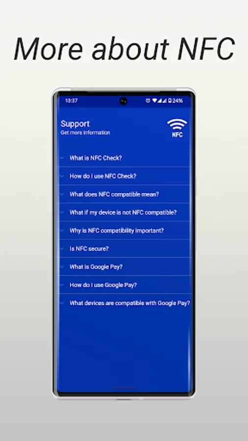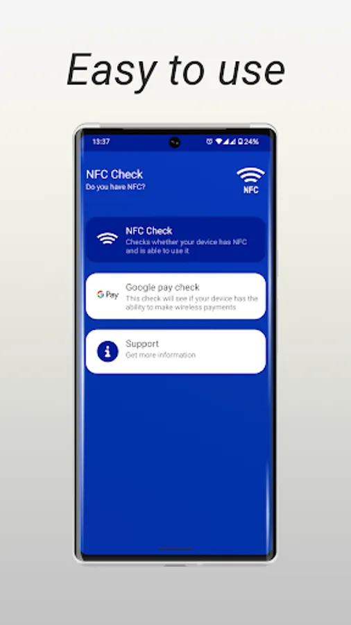 With NFC Check you can quickly and easily check whether your phone supports NFC and if so, whether it is compatible with G Pay (Google Pay). Use our app to test your NFC reader and check the functionality of Google Pay on your phone.