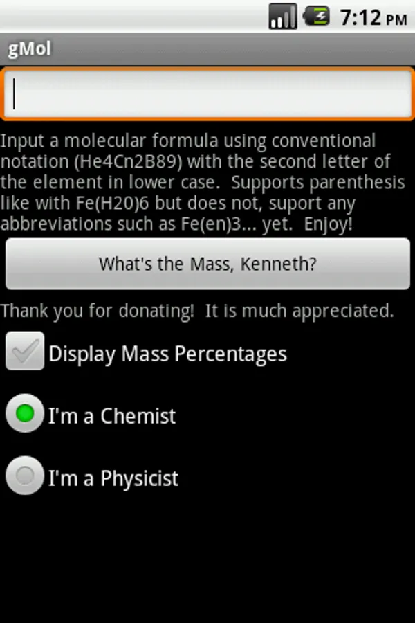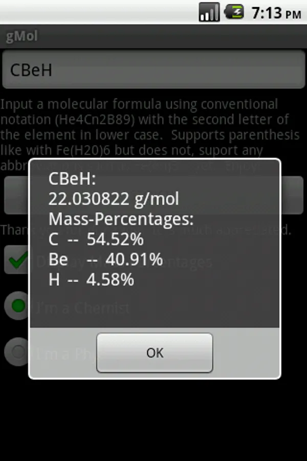 DO NOT DOWNLOAD! New version available. Search android Market for "gMol--Molar Mass Tool" or just click to see this publisher's other apps.