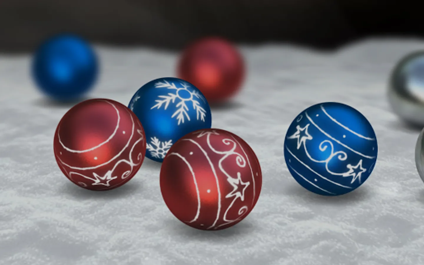 Watch those natural-looking Christmas ornaments that have been carefully laid out on a snow-covered table, while snowflakes are gently falling in the background. All rendered in real time 3D with lighting and reflections!