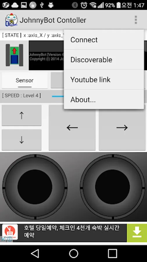 By default, the App will run Manual Mode to Control Use the arrow buttons at runtime, you can enter the JohnnyBot and Bluetooth connect and various command directly.