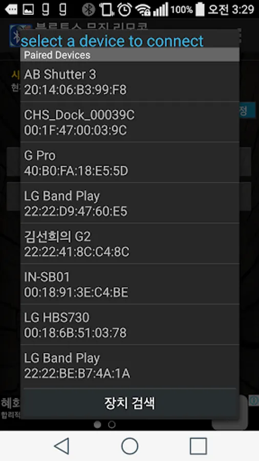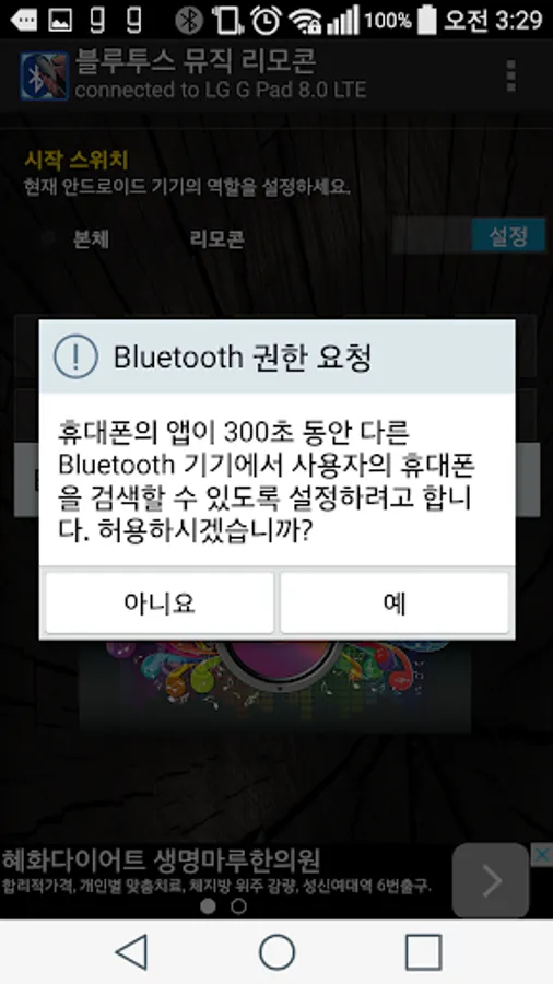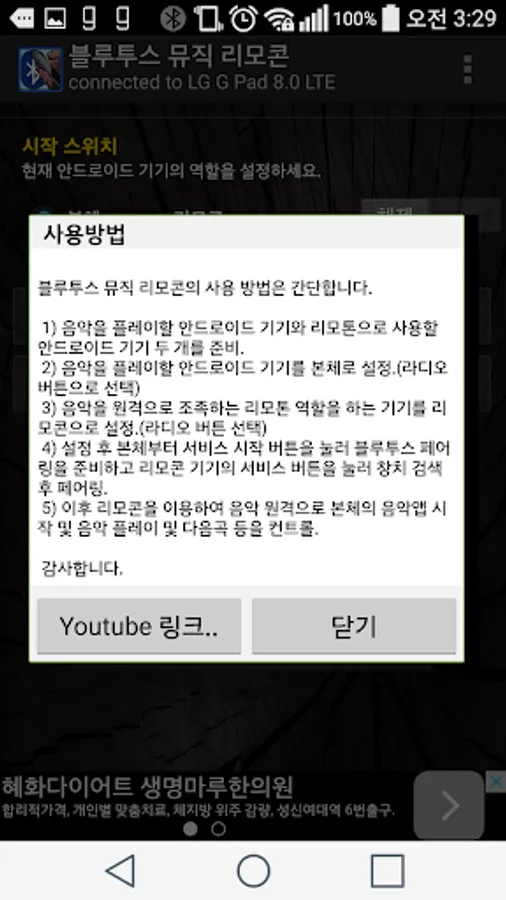 4) Set the service to start, and then press the pairing button on the body after a search from the Bluetooth pairing ready changchi and press the service button on the remote control unit.