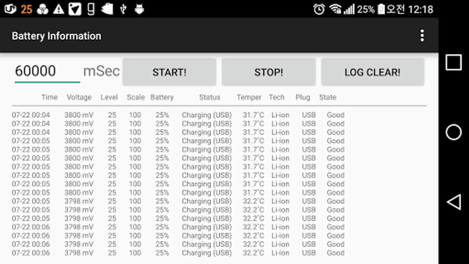 Set the logging time and press the Start button shows the Battery information in a set time interval.