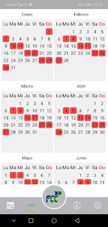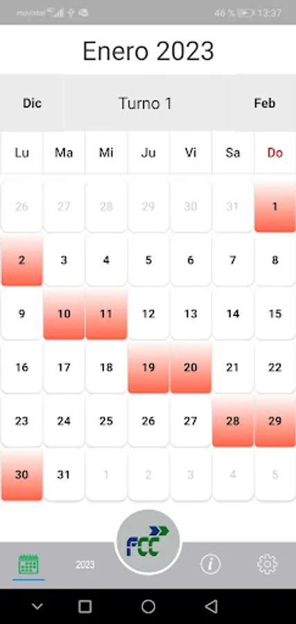 Calendar of the company FCC Medio Ambiente for the Mixed Shift of the City of Barcelona.