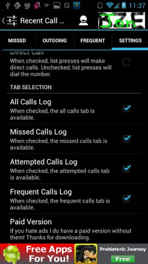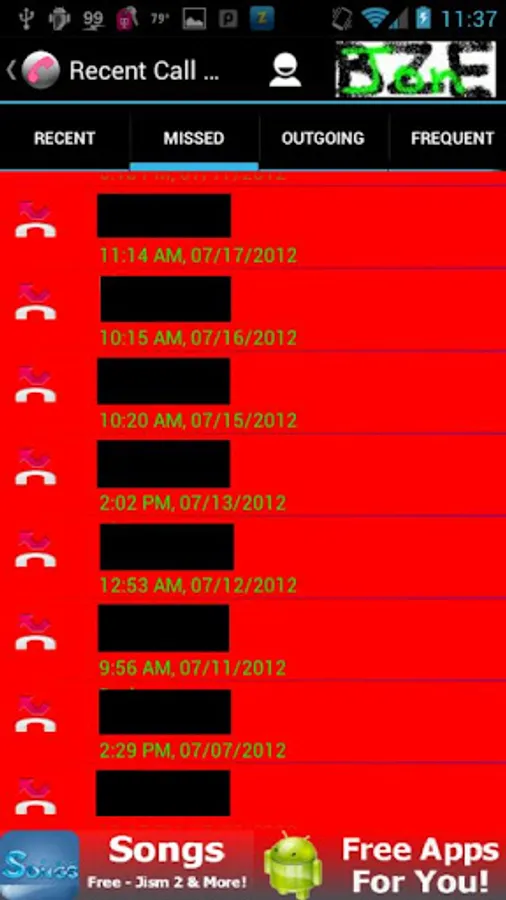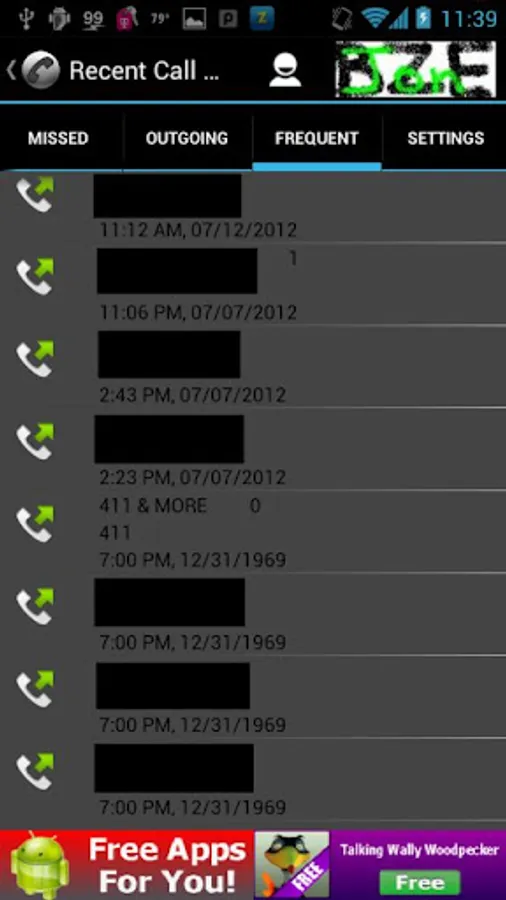 Simple recent call log for your device. Provides tabs for recent contacts, missed contacts, attempted contacts, and frequent contacts.