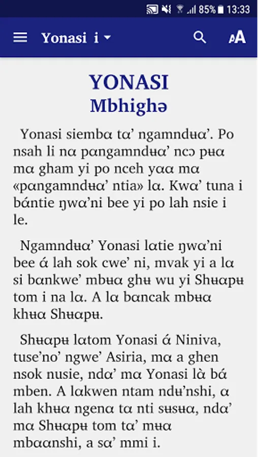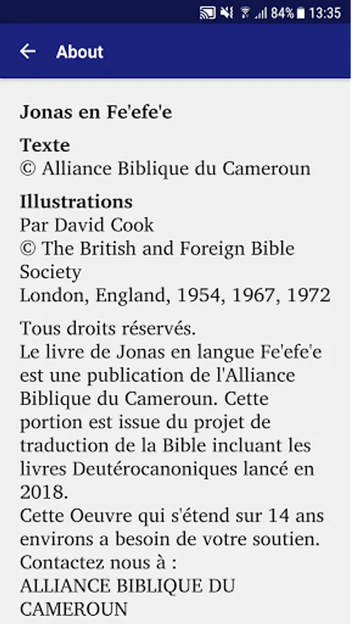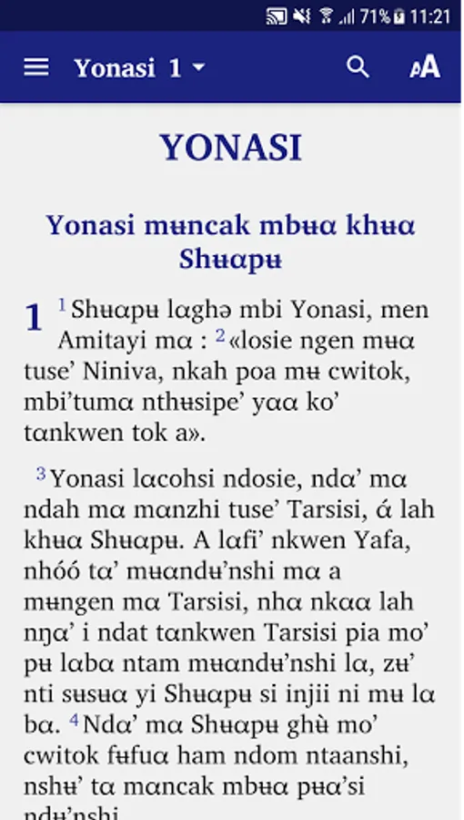 Jonah's book in the Fe'efe'e language of West Cameroon is a publication of the Biblical Alliance of Cameroon. It is part of the ongoing full Bible translation project including Deuterocanonical books launched in September 2018.