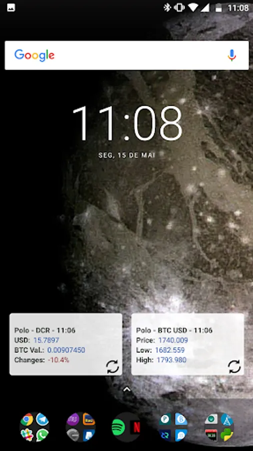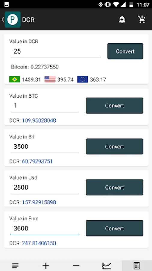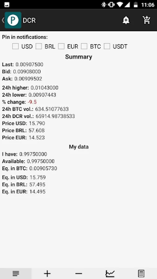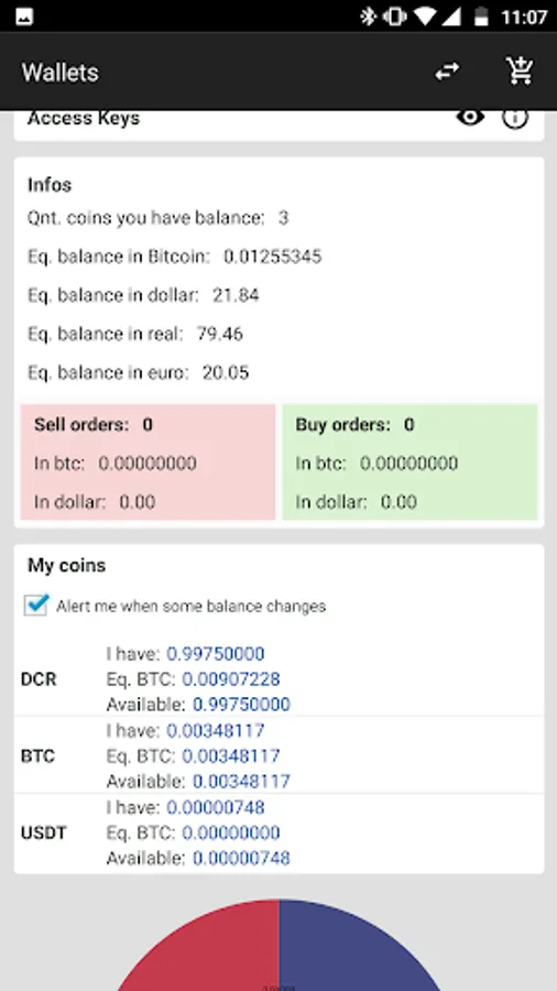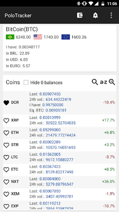 Now, you also can see your currencies and its values in Bitcoin, euro, dollar and real.