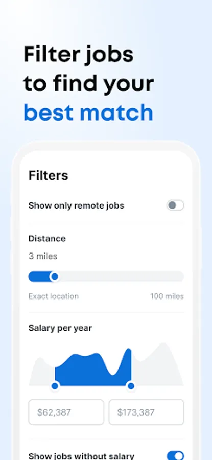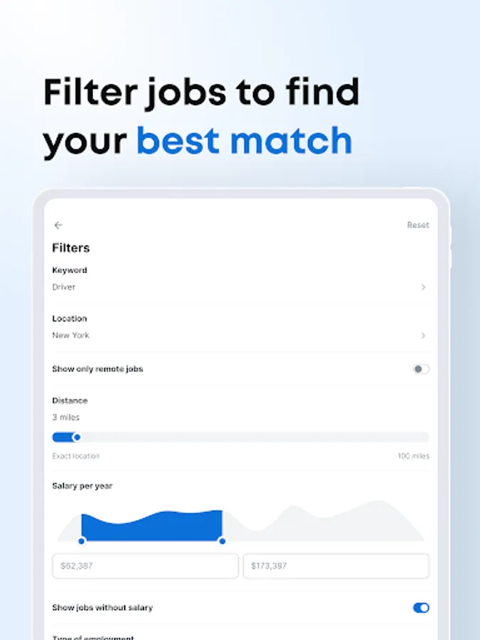 Use Jooble to research job roles based on your search queries and set your preferred geographical location as per your needs. You can set geographic preferences to find the convenient country/state/city/and select jobs that fit your experience and skills. Download the app, create your account without a Jooble resume, and get instant access to the best job search service.