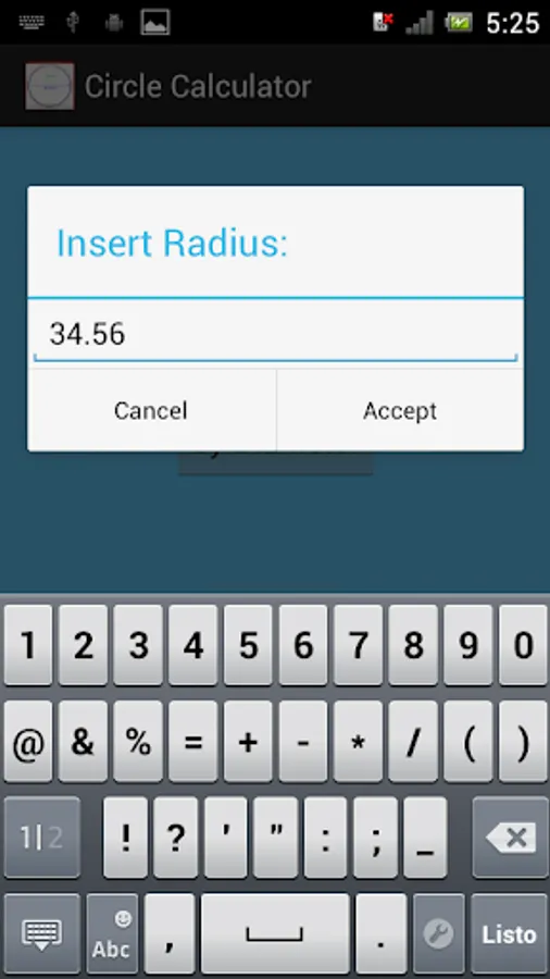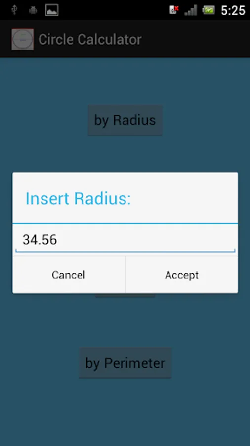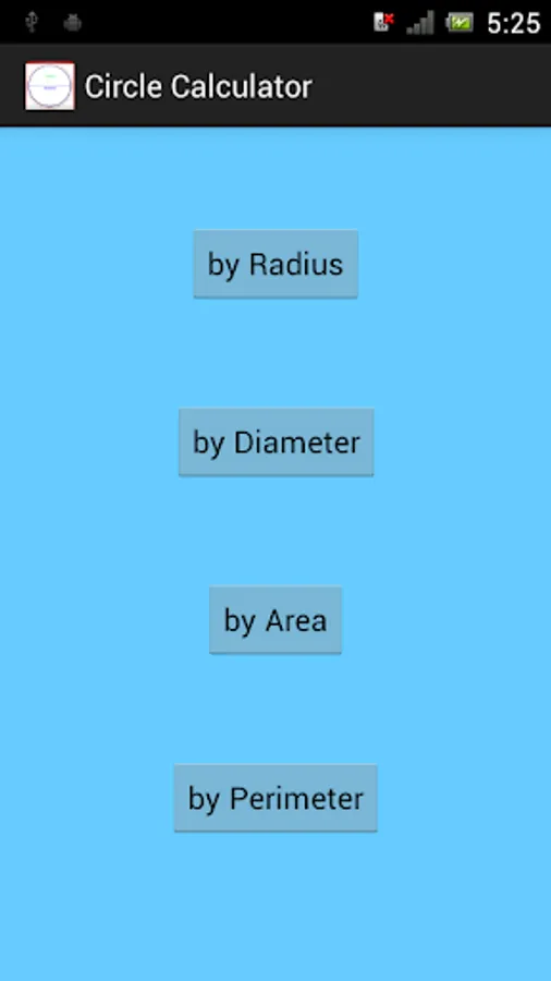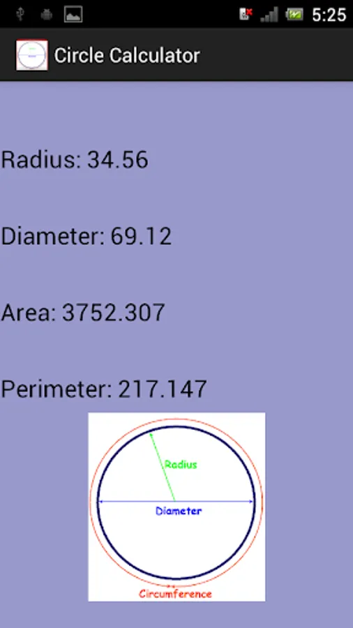 This application is used to calculate the radius, diameter, perimeter and area of a circle.