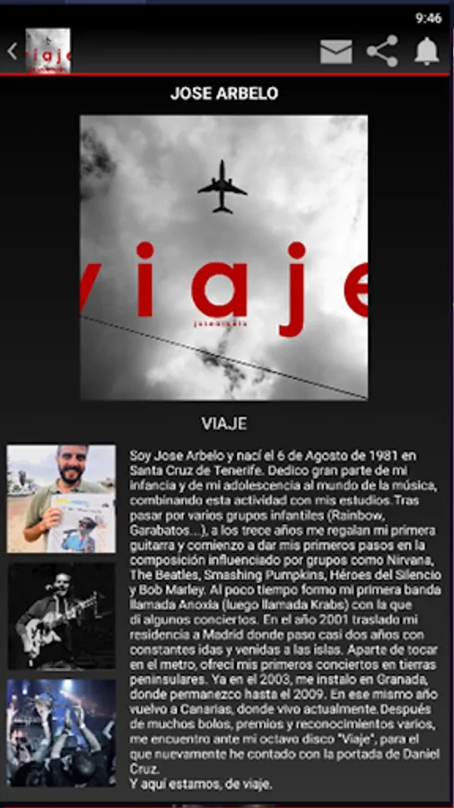 I am Jose Arbelo and I was born on August 6, 1981 in Santa Cruz de Tenerife. I dedicate a large part of my childhood and adolescence to the world of music, combining this activity with my studies.After going through various children's groups (Rainbow, Doodles ...), at thirteen they gave me my first guitar and I started to take my first steps in composition influenced by groups like Nirvana, The Beatles, Smashing Pumpkins, Heroes of Silence and Bob Marley. Before long I formed my first band called Anoxia (later called Krabs) with whom I gave some concerts. In 2001 I moved my residence to Madrid where I spent almost two years with constant comings and goings to the islands. Apart from playing in the subway, I gave my first concerts in peninsular lands. Already in 2003, I settled in Granada, where I stayed until 2009. In that same year I returned to the Canary Islands, where I currently live. After many bowling, awards and various recognitions, I find myself before my eighth album "Viaje", for the I have had a wonderful team of musicians and sound professionals. And here we are, on a trip.