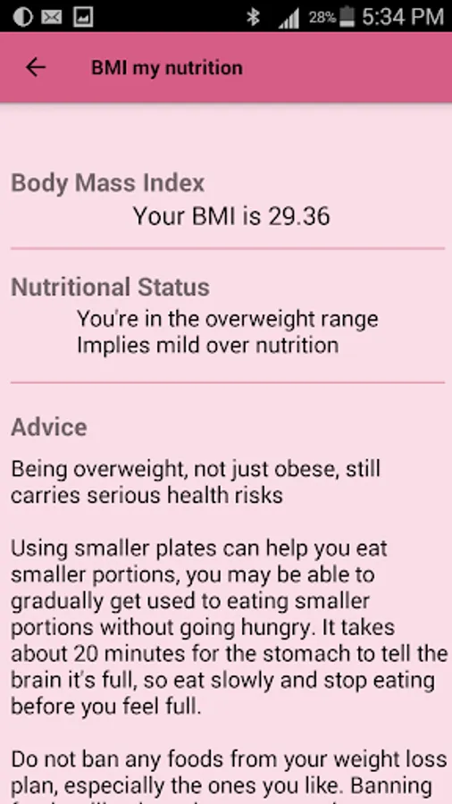 This application does not only ends on Body Mass Index results but it also establish and shows the relationship between the your BMI and Nutritional Status then give the advice in summery on how to overcome the situation according to Nutritional Status results found.
