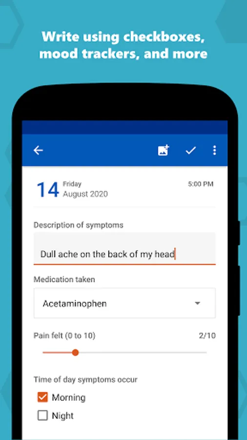 Easily track and correlate your everyday health data however you want with your own custom health templates. Track symptoms, health, diet, mood. You can create health templates to track your unique needs and symptoms. You can also log your medications and correlations such as correlating diet with symptoms, mood, and more. Instead of using a health diary that is static and only tracks certain health conditions, with this diary, you can track your own health problems exactly as you need. You can also use it to record medical history and data as a lifetime health tracker