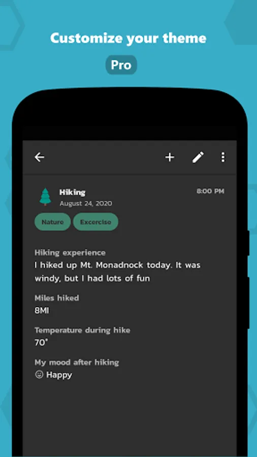 Use the app as both a custom diary and a private diary. Flexible Journal stores all your data offline in its own database so all your data is private unless shared. It’s also a journal with lock so you can pin-lock your data if you’re a pro subscriber