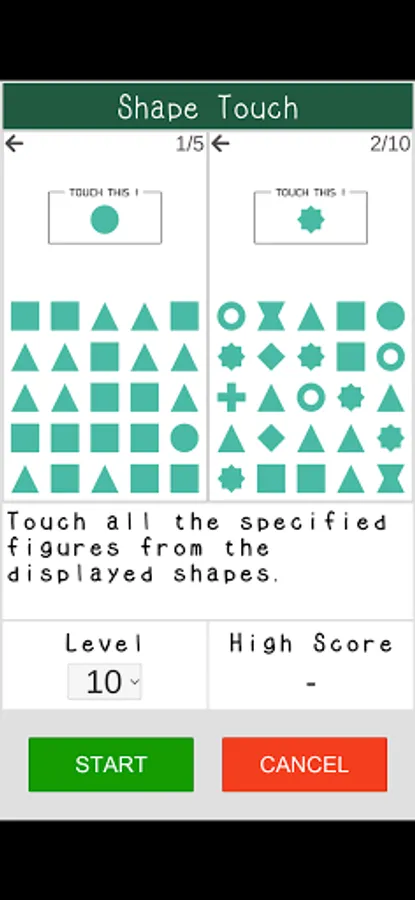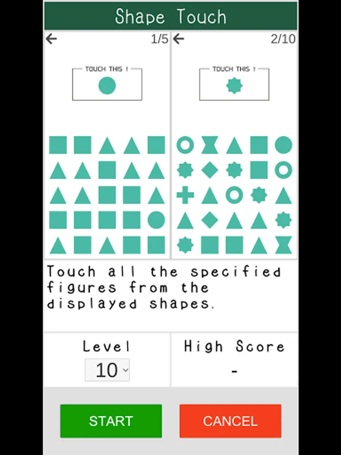 5. Shape Touch : Many shapes are shown. Touch all targeted shapes.