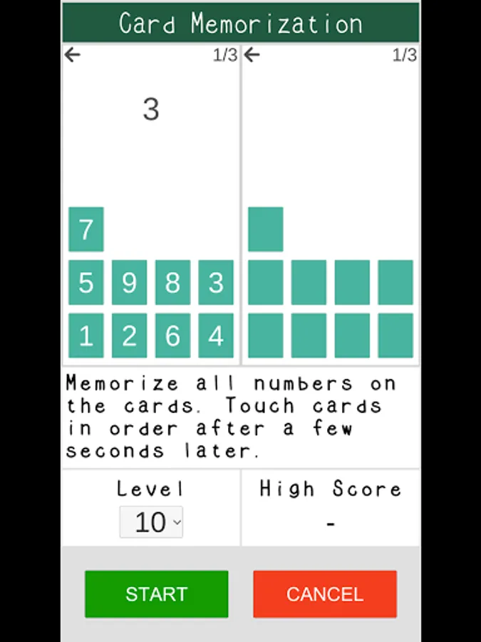 3. Card Memorization : Memorize the number on the cards. Then touch cards in order.
