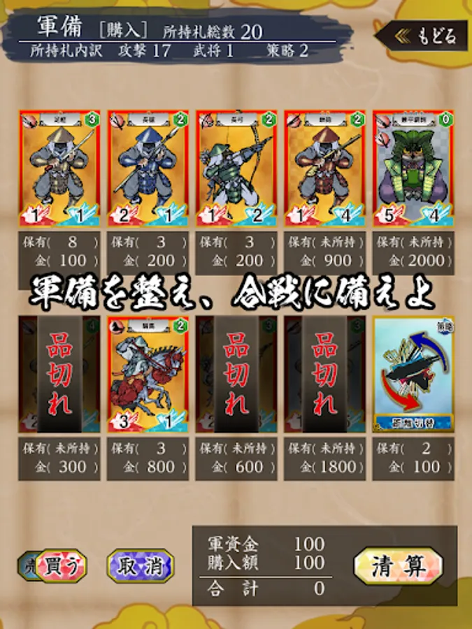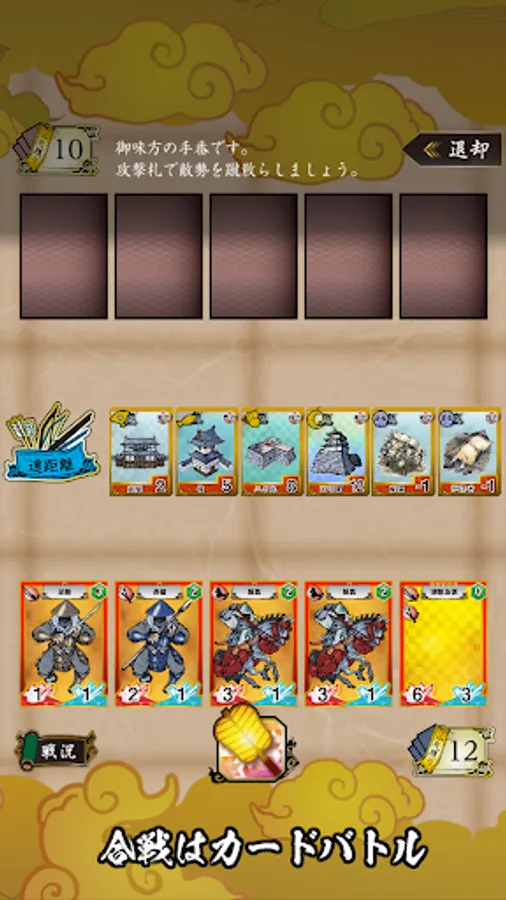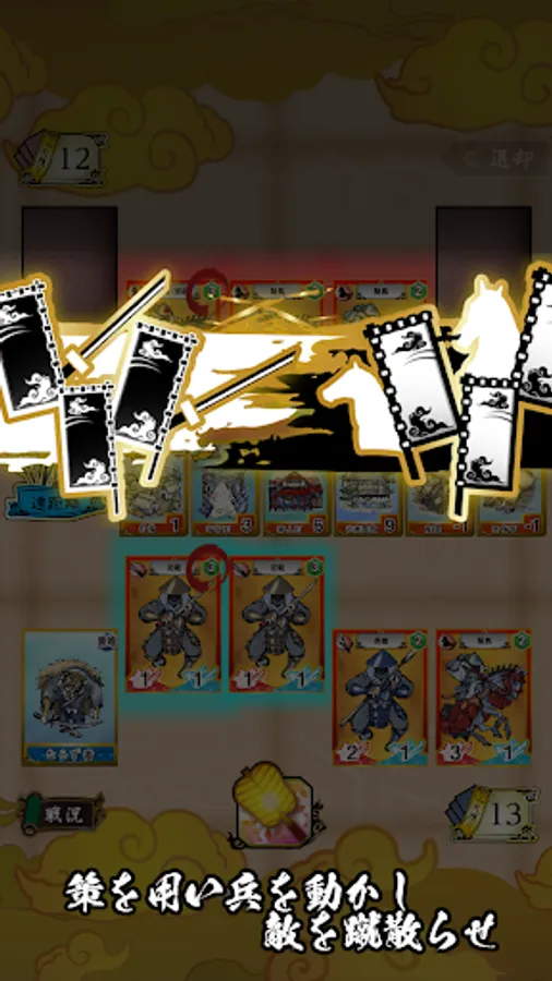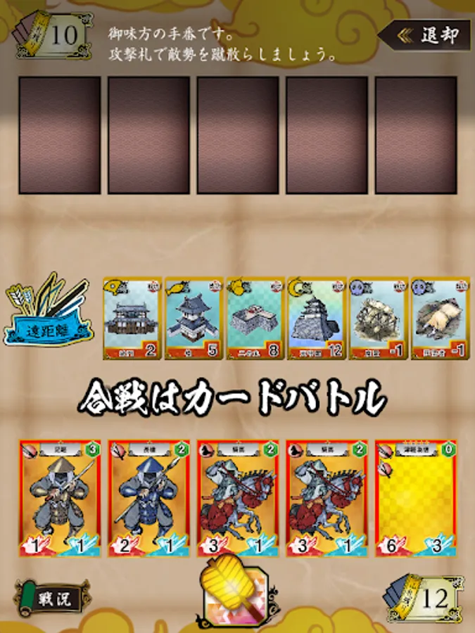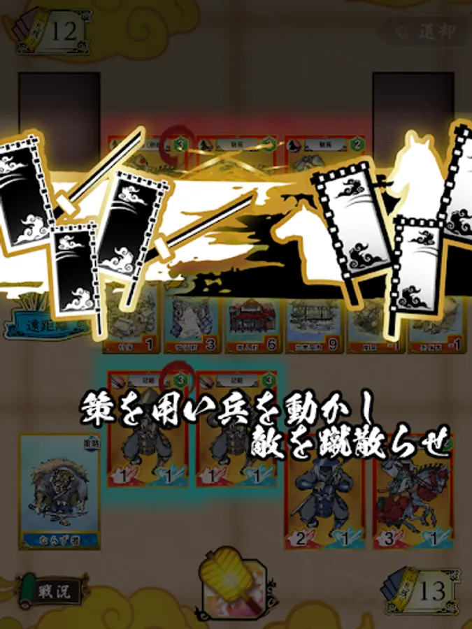 強力な攻撃札(兵)を集め、策略札を駆使し、戦功札(建物や拠点)を稼ぐことで合戦を勝利に導いてください。合戦に勝利し新たな領地を手に入れると秋の税収が増えます。軍資金を集めて更に強力な攻撃札を買い入れましょう。