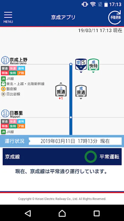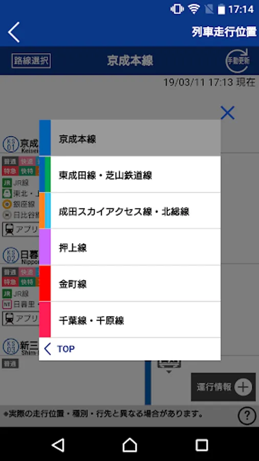 京成線・北総線・芝山鉄道線の列車走行位置、列車の種別・行先、遅延時間をリアルタイムにご確認いただけます。