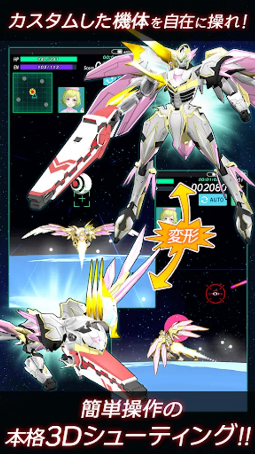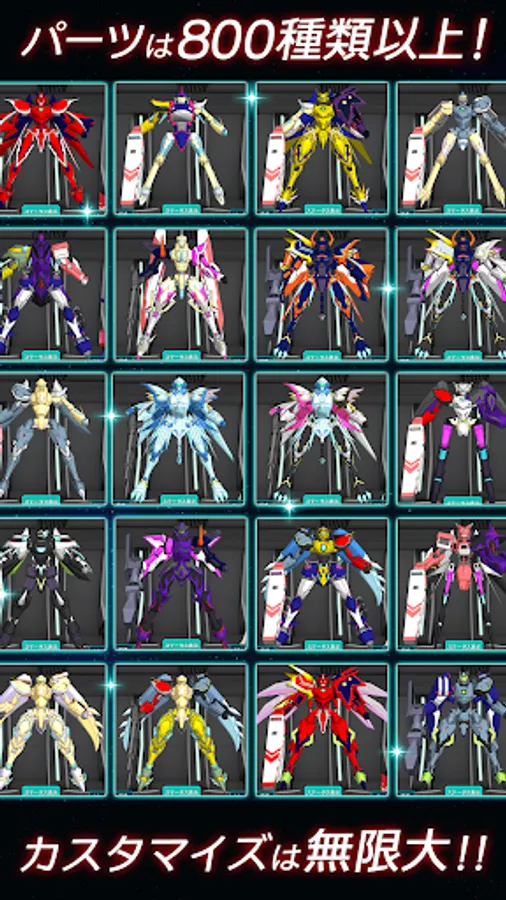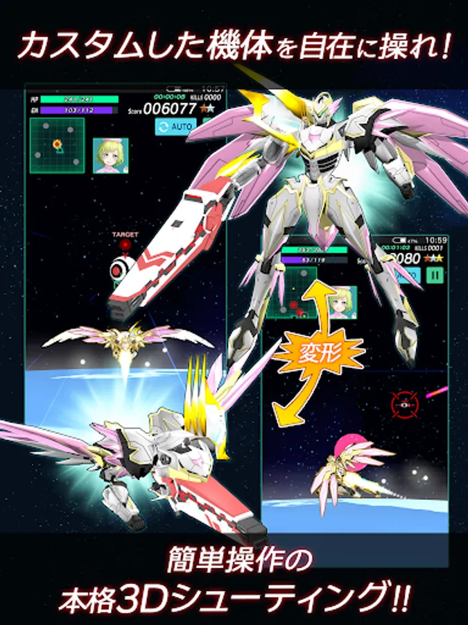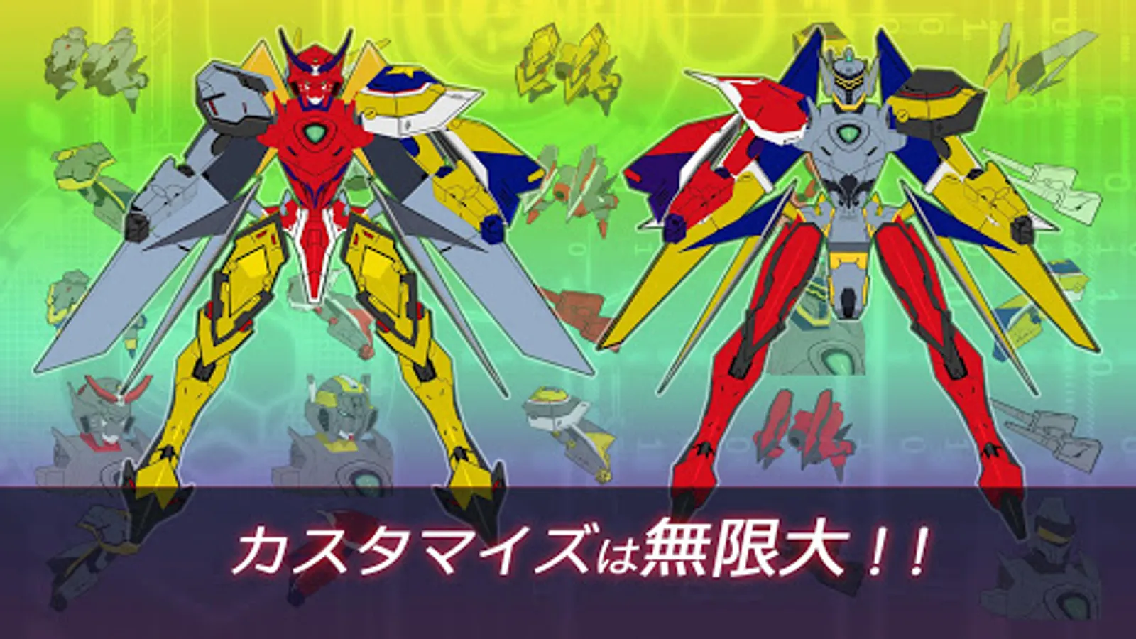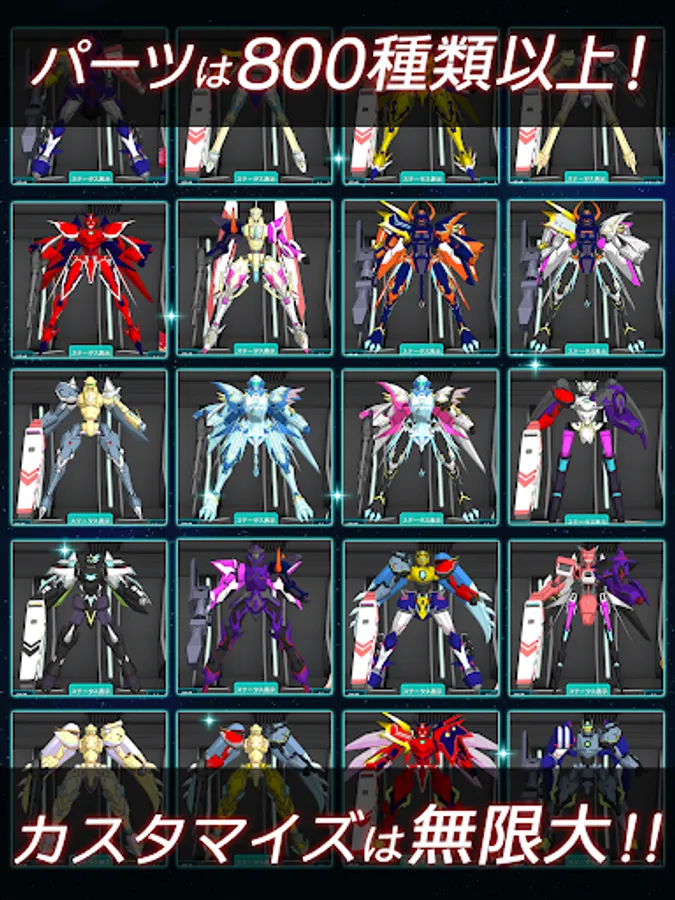 The aircraft that transforms from a fighter to a robot consists of 7 parts: core, right arm, left arm, legs, wings, sub weapons, and main weapon, and you can change it to your favorite parts.