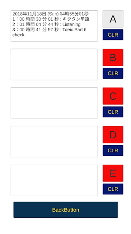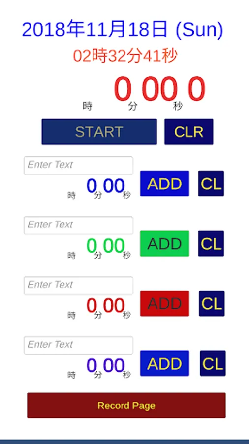 タイマーは、「START」ボタンを押すことによってスタートし、再度押すと「PAUSE」になります。ボタン表示が「PAUSE」の時に、4つある各項目の「ADD」ボタンを押すとタイマーの数値が記録されます。
