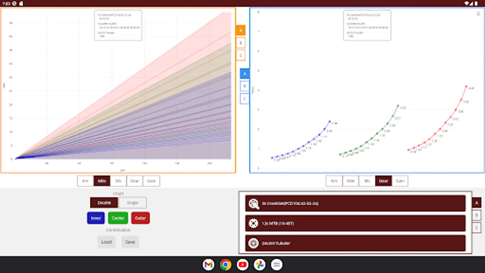 It creates speed-cadence and gear ratio graphs from 22 different chainwheel, 39 different sprocket, and 70 different tire combinations.
