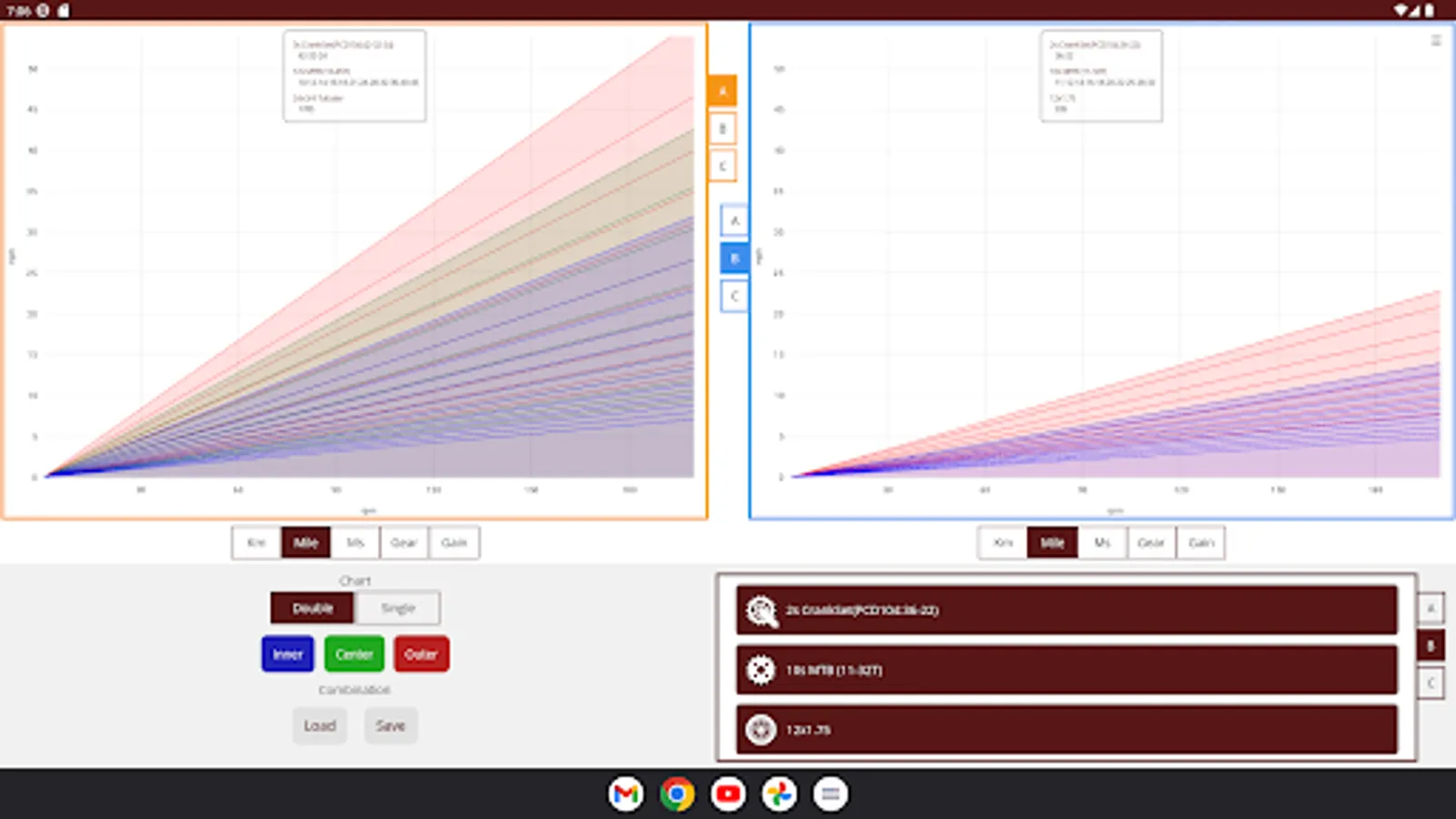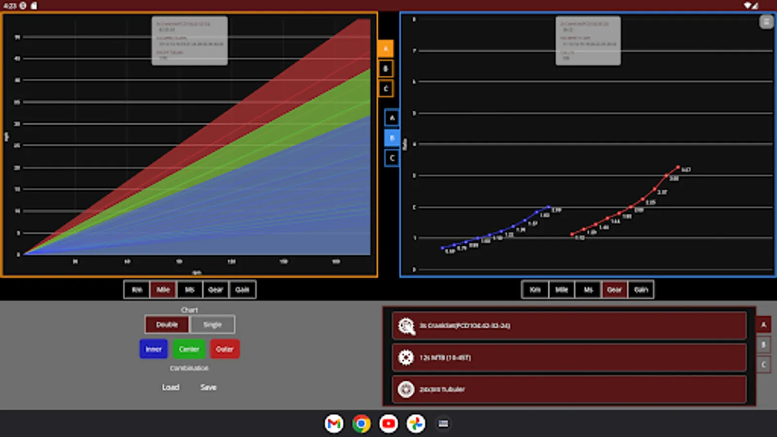 By turning on and off the display for each gear in the outer center and inner center, you can simulate the optimum gear ratio.