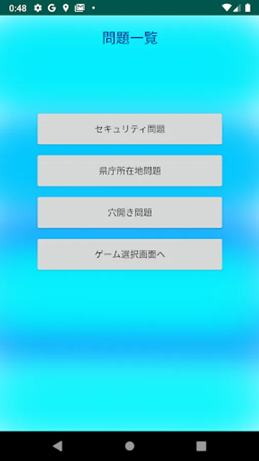 Quiz game: There are three problems: security problem (4 choices related to computer security), problem of guessing prefecture location, and blank-filling problem.