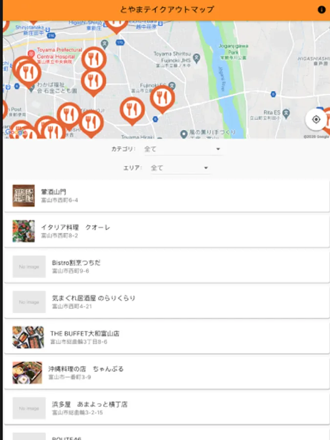 It is an application that displays a map and list of stores that can be taken out in Toyama Prefecture. The data is linked with the website "Toyama Takeout Map" of Tulip Television Co., Ltd.