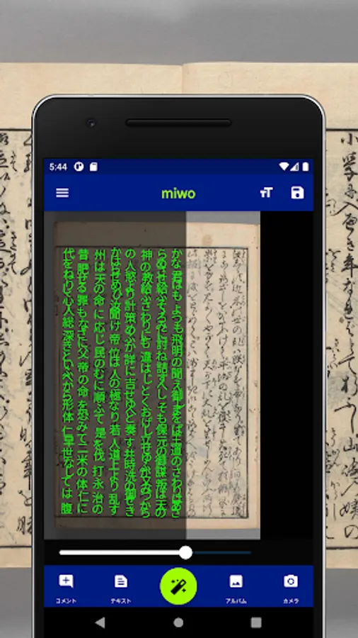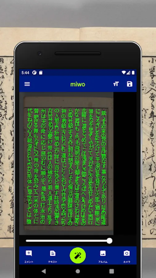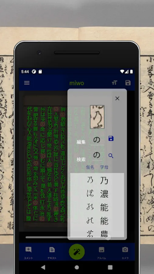 The ROIS-DS Humanities Open Data Shared Use Center (CODH) has developed an AI shaving character recognition technology that has the function of converting (reprinting) the shaving characters contained in images into modern characters. The AI kuzuji recognition smartphone app "miwo" was developed with the aim of making this technology easy for anyone to use.