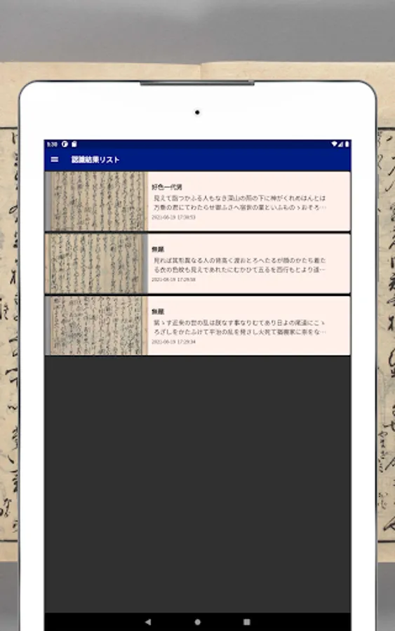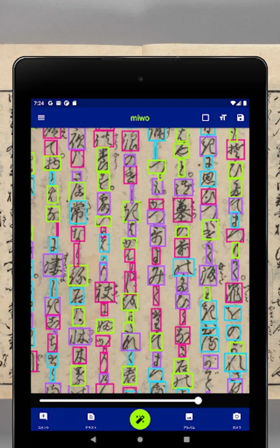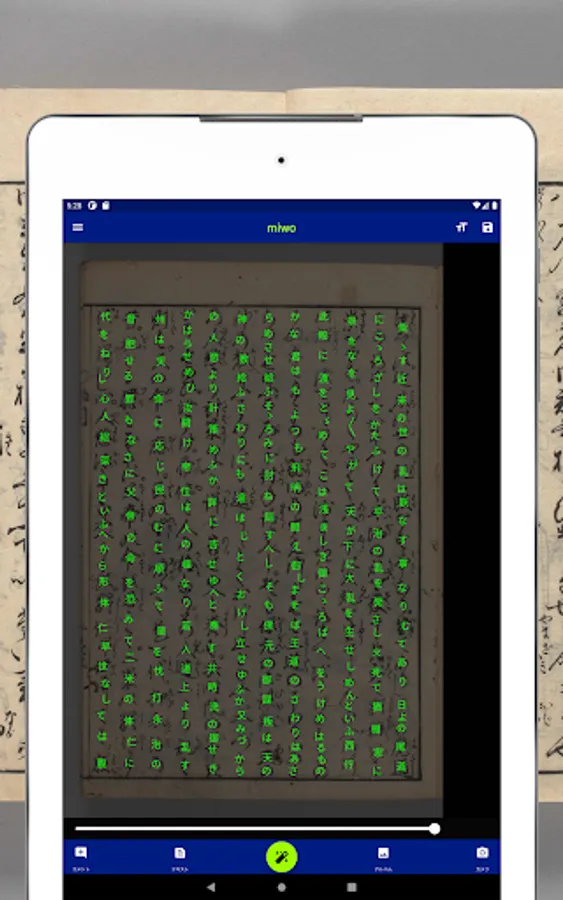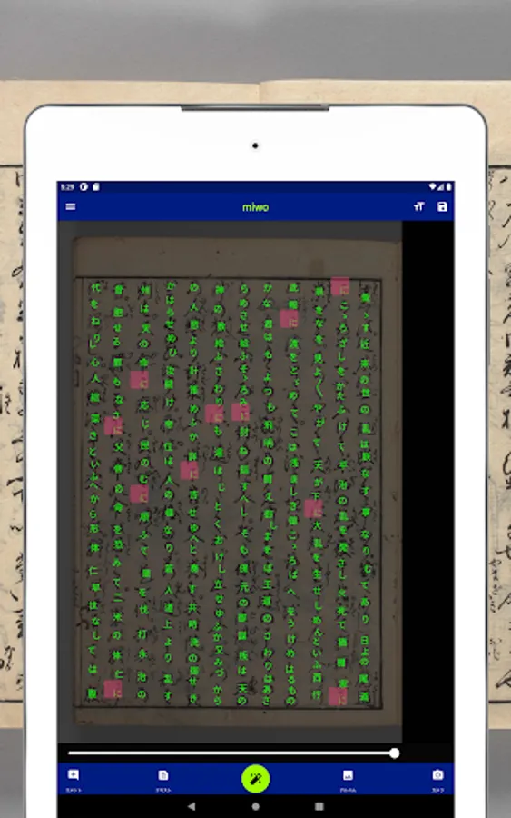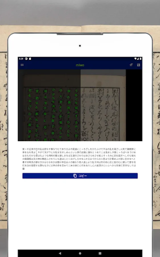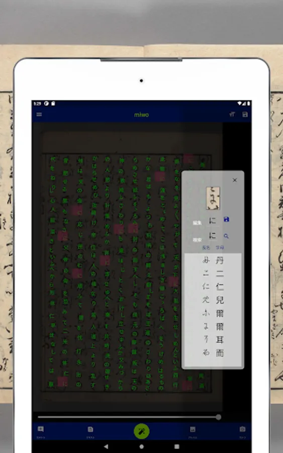 "Mio" is named after "Mio Tsukushi", the 14th book of "Genji Monogatari". Just as "Mio Tsukushi" serves as a pilot guide for people, we aim to use the "Mio" app as a guide for traveling through the sea of cursive script materials.